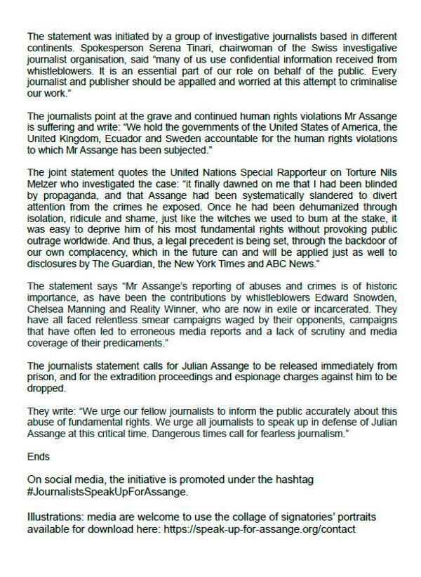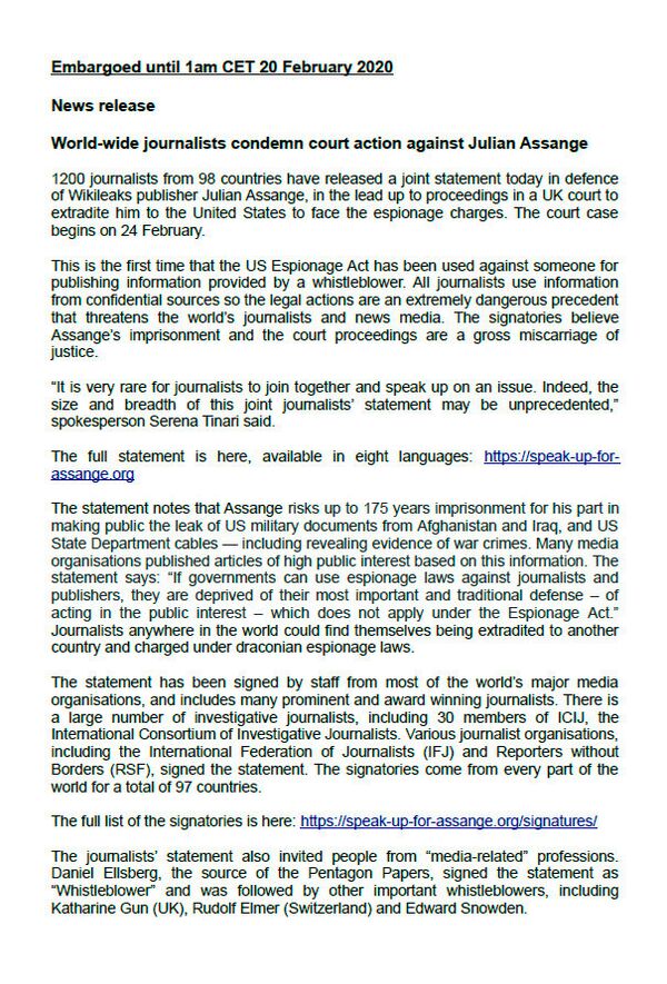 20 февраля опубликовано заявление журналистов мира в защиту Джулиана Ассанжа. К открытому письму присоединились 1200 журналистов из 98 стран. Инициаторы сбора подписей, Серена Тинари из Швейцарии, Блаж Згага из Словении и Ники Хагер из Новой Зеландии считают, что в случае экстрадиции любой журналист в мире окажется в опасности, поскольку правительства будут заводить такие уголовные дела для того, чтобы, по словам Нильса Мельцера, «отвлечь внимание от преступлений».