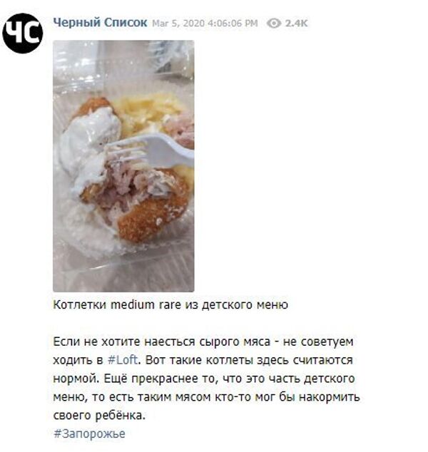 «Котлетки medium rare из детского меню. Если не хотите наесться сырого мяса — не советуем ходить в Loft. Вот такие котлеты здесь считаются нормой. Еще прекраснее то, что это часть детского меню, то есть таким мясом кто-то мог бы накормить своего ребенка», — говорится в подписи к фотографии.
