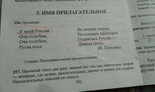 Отмечается, что учительница одной из школ дает задание по учебнику авторов Петрюк Л.П. и Рысованой З.Г. «Пособие по изучению русского языка в школах с украинским языком обучения». 4 класс. — М.: Слово, 2014, где предлагается детям подчеркнуть прилагательные в тексте песни «Ты цвети, Россия», известной в исполнении Людмилы Зыкиной.