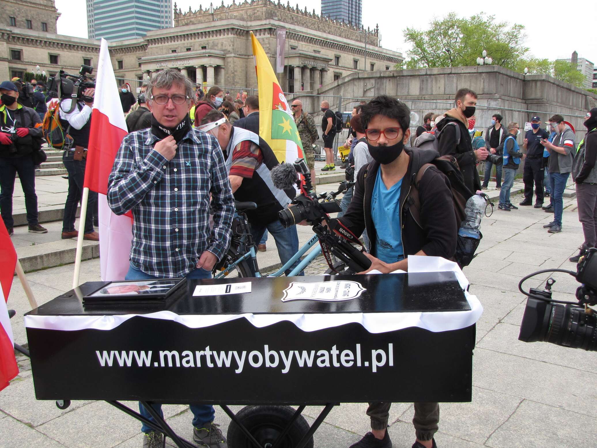 Поэтому неудивительно, что днём 23 мая у стен Дворца культуры и науки собралось не более 200 участников акции протеста (при этом среди собравшихся несложно было узнать сотрудников правоохранительных органов в штатском). Пришли также около сотни журналистов и… более двух тысяч сотрудников полиции! Их собирали со всей Польши, причём руководство полиции столкнулось с молчаливым саботажем: к примеру, во Вроцлаве 80 полицейских накануне отправки в столицы ушли на больничный. Скажу честно: столько людей в форме в одном месте в Варшаве я до этого видел только на военных парадах. Правда, военной техники на этот раз не было, зато её с лихвой компенсировали полицейские фургоны — их в окрестностях площади Шествий было около сотни. Полиция также пригнала пикап с мощными колонками, откуда постоянно звучал призыв разойтись, потому что любые массовые собрания запрещены в связи с продолжающимся в Польше состоянием эпидемической угрозы.