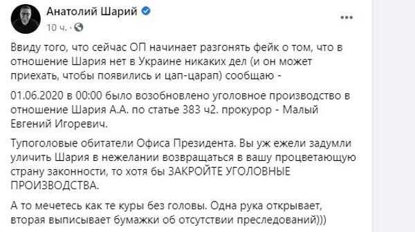 «Ввиду того, что сейчас ОП начинает разгонять фейк о том, что в отношение Шария нет в Украине никаких дел (и он может приехать, чтобы появились и цап-царап) сообщаю — 01.06.2020 в 00:00 было возобновлено уголовное производство в отношение Шария А.А. по статье 383 ч2. прокурор — Малый Евгений Игоревич. Тупоголовые обитатели Офиса Президента. Вы уж ежели задумали уличить Шария в нежелании возвращаться в вашу процветающую страну законности, то хотя бы закройте уголовные производства. А то мечетесь как те куры без головы. Одна рука открывает, вторая выписывает бумажки об отсутствии преследований», — написал он.