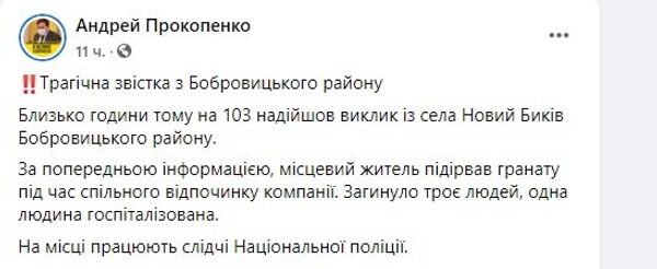 «Трагическая новость из Бобровицкого района… По предварительной информации, местный житель подорвал гранату во время совместного отдыха компании. Погибли три человека, один человек госпитализирован», — написал Прокопенко.