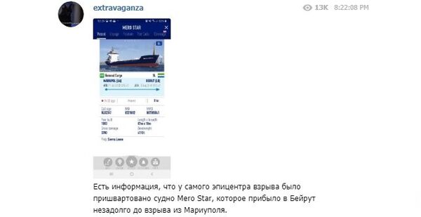 «Есть информация, что у самого эпицентра взрыва было пришвартовано судно Mero Star, которое прибыло в Бейрут незадолго до взрыва из Мариуполя», — говорится в посте.
