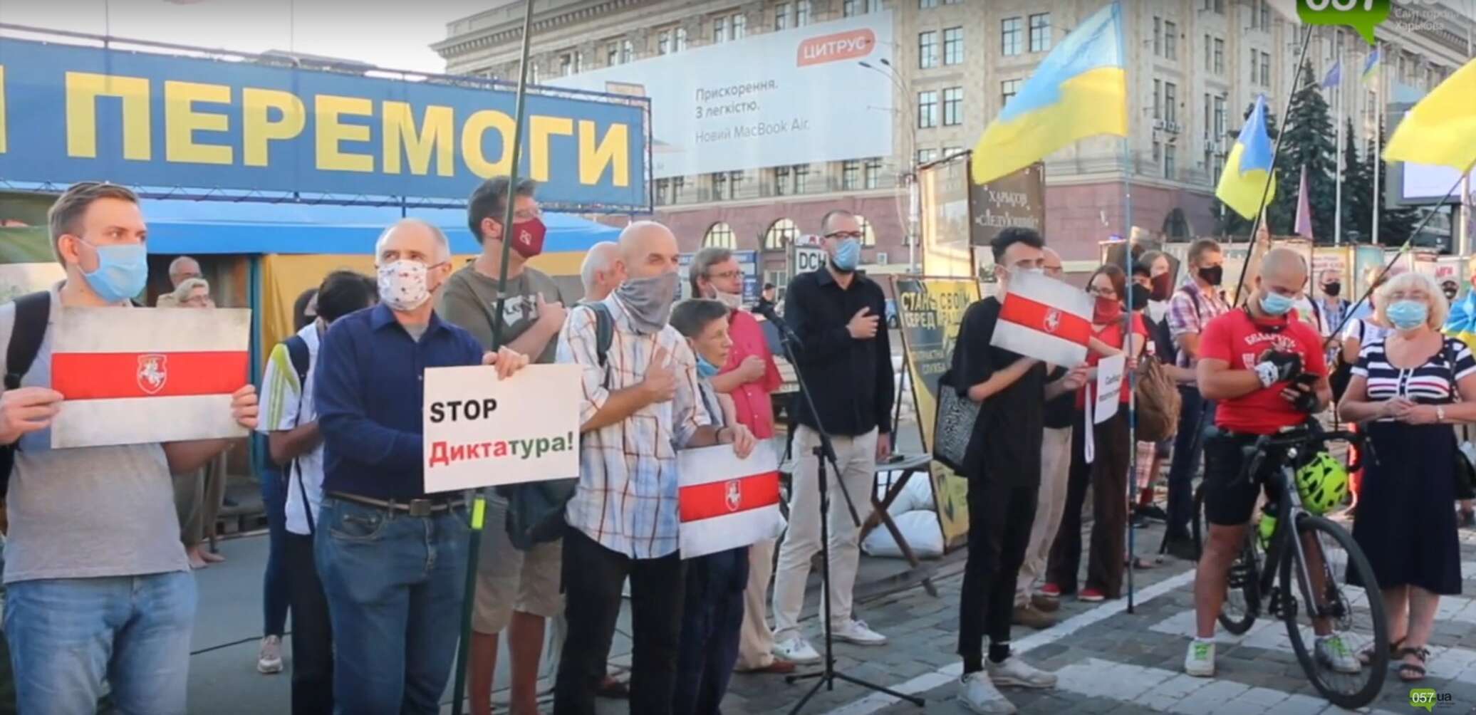 Отмечается, что харьковчане вышли на площадь с флагами Белоруссии и плакатами с надписями «Да здравствует Беларусь», «Долой таракана усатого» и «Держитесь, друзья».