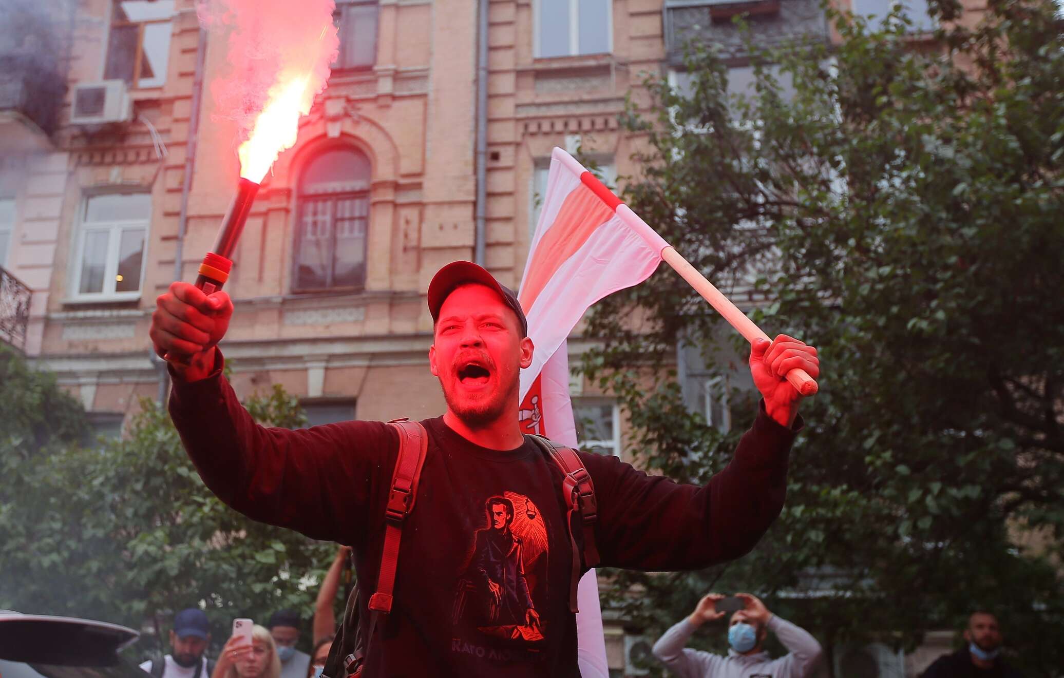 Очередное такое мероприятие проходит возле посольства Белоруссии, так собралось около 40 человек, в основном молодежь. В руках они держат бело-красно-белые флаги, которые используют противники Лукашенко, а также плакаты с лозунгом «Жыве Беларусь». Одна из участниц (или участников, по фото установить невозможно) акции пришла в медицинской маске в цветах ЛГБТ-сообщества и с плакатом аналогичных цветов.