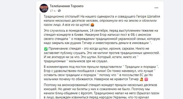 На украинского комика, сценариста и соведущего социально-юмористического проекта «Телебачення Торонто» Егора Шатайло напали в Киеве несколько десятков человек. Об этом 15 сентября сообщили на странице проекта в Facebook