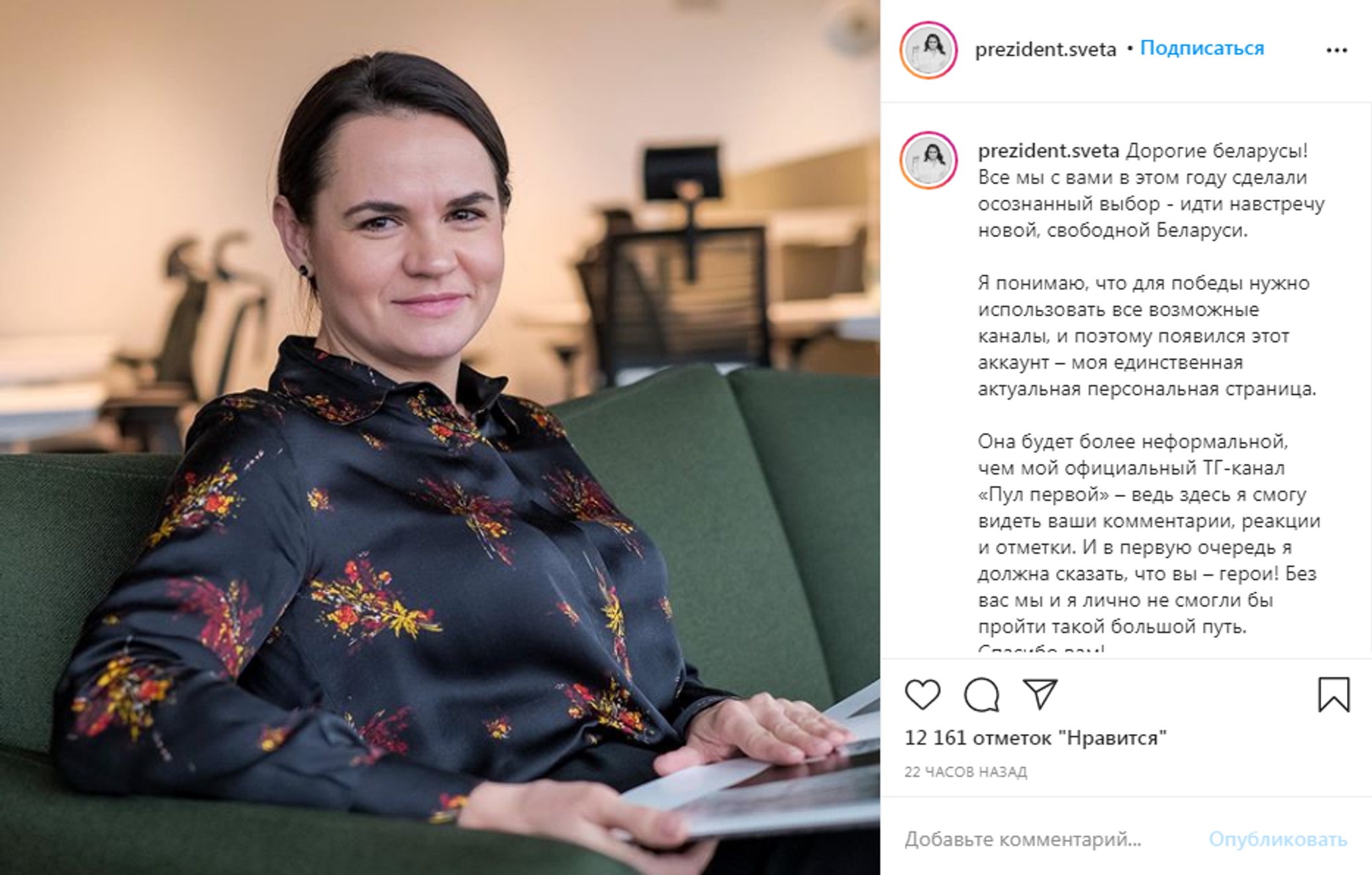 «Я понимаю, что для победы нужно использовать все возможные каналы, и поэтому появился этот аккаунт — моя единственная актуальная персональная страница», — написала Тихановская.