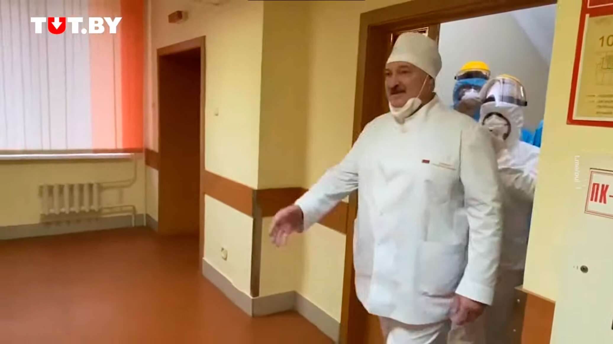Медик пояснила, что они находятся в «красной зоне» больницы, и Александр Лукашенко все же надел маску, закрыв органы дыхания, а перчатки захватил с собой, но не надел.