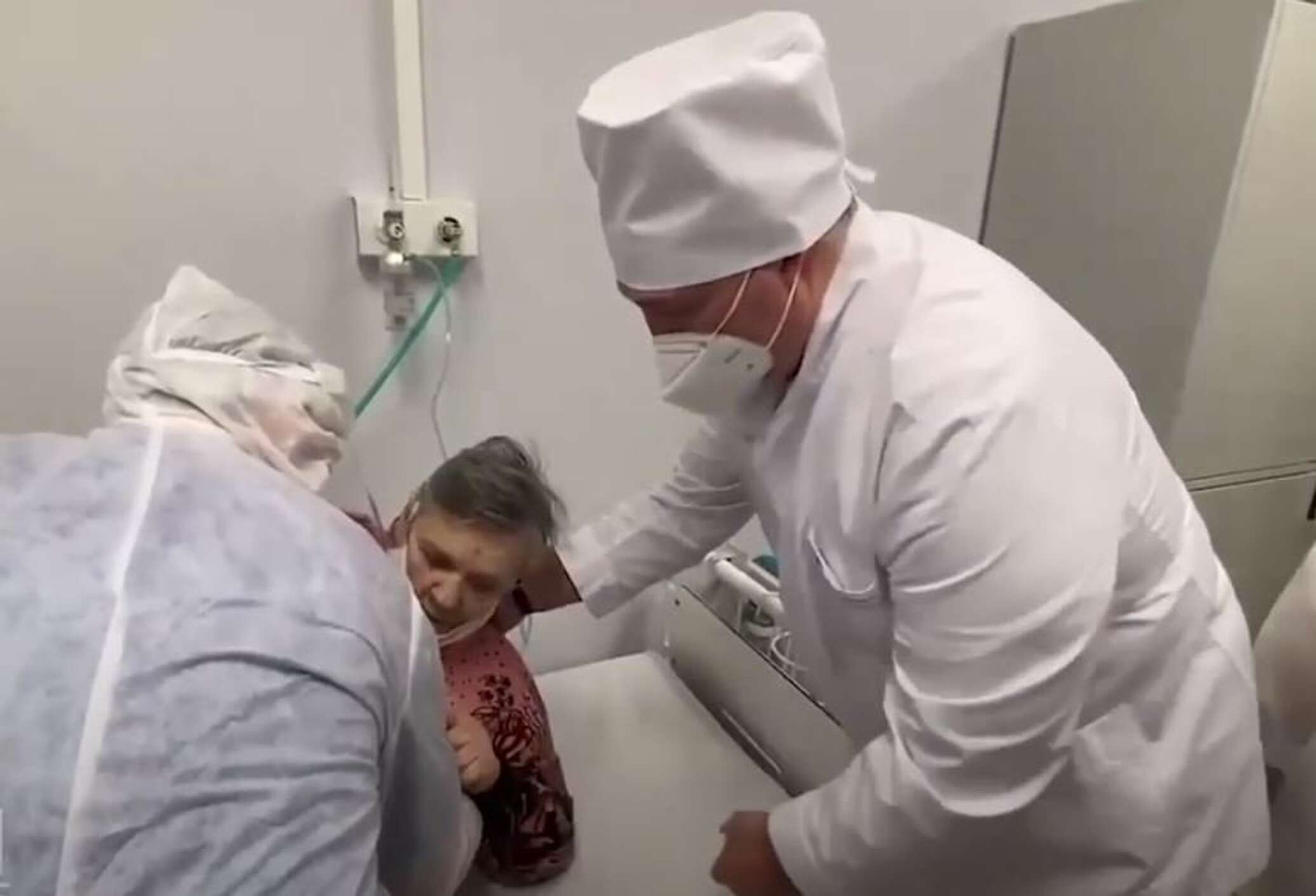 На видео Лукашенко помогает пожилой пациенте приподняться и попить воды из бутылки.