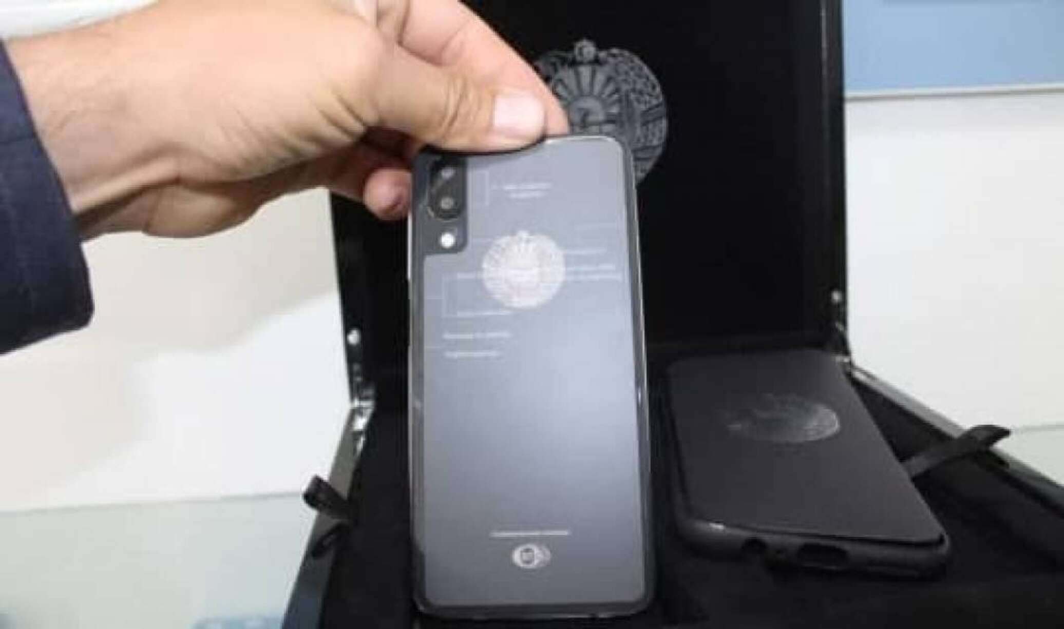 По центру телефонной панели девайса расположен государственный герб Узбекистана, устройство упаковано в специальную подарочную коробочку.