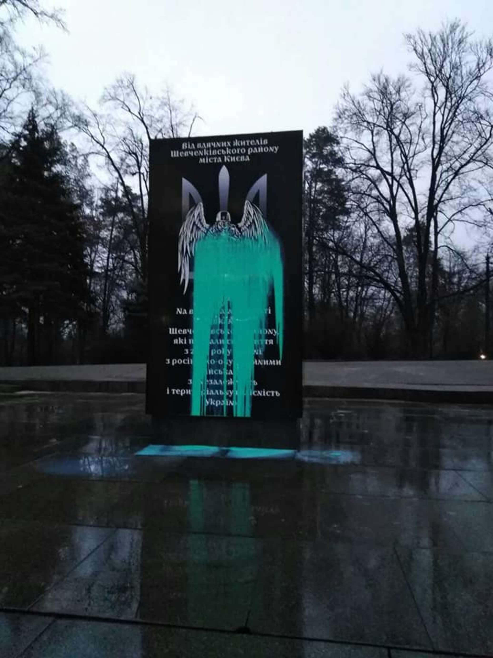 «Предновогоднее утро началось с неприятных находок. Вандалами был облит краской памятник воинам АТО, который расположен вблизи станции метрополитена "Берестейская"», — пишут авторы сообщения.