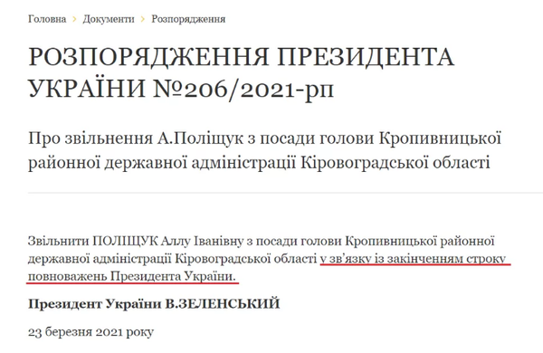 «Уволить Полищук Аллу Ивановну с должности главы Кропивницкой районной государственной администрации Кировоградской области в связи с окончанием срока полномочий президента Украины», — говорилось в документе.