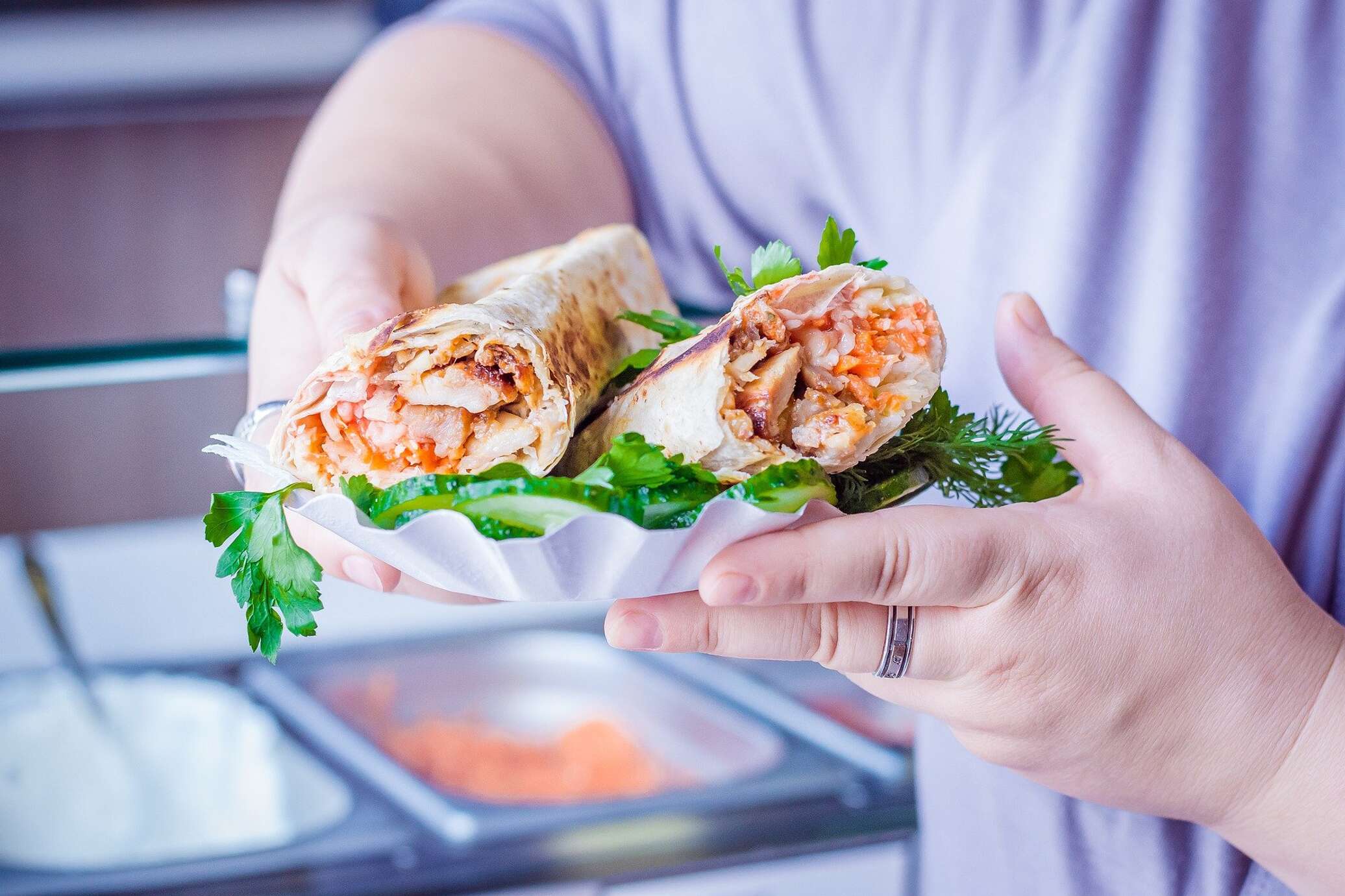 Шаурма — ближневосточное блюдо из мяса, обжаренного на вертеле и завернутого в лаваш с добавлением специй, соусов и салата. Это блюдо считается одним из самых демократических как по цене, так и по употреблению — шаурму принято есть без столовых приборов.