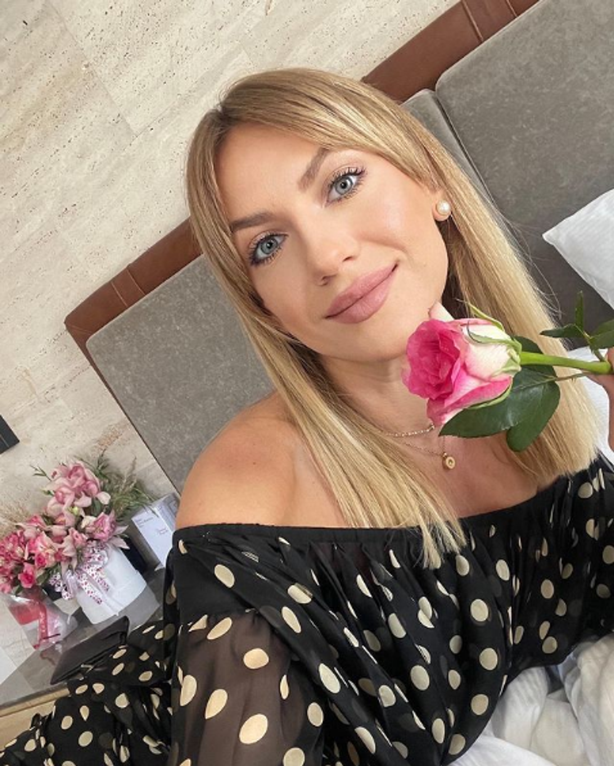 На снимке Никитюк в платье в горошек, открывающем плечи, и с букетом розовых роз.