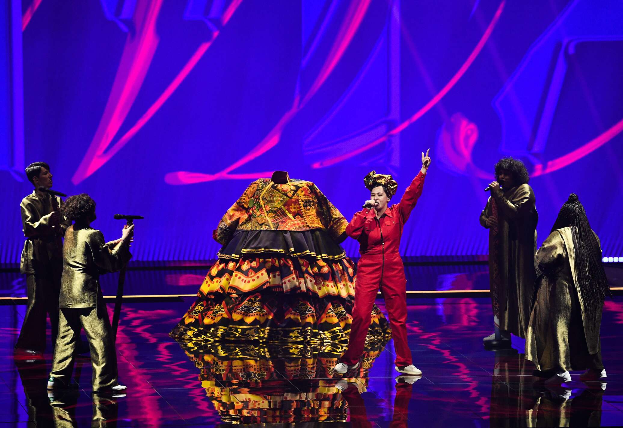 Манижа, родившаяся в Таджикистане, на «Евровидении» поёт не просто о России, где выросла, а о русской женщине, её песня так и называется Russian Woman. В начале номера певица появилась на сцене в огромном платье, сшитом из лоскутов ткани национальных костюмов, которые прислали женщины из разных регионов страны, а потом продолжает выступление в красном рабочем комбинезоне, символизирующем усердный труд россиянок.