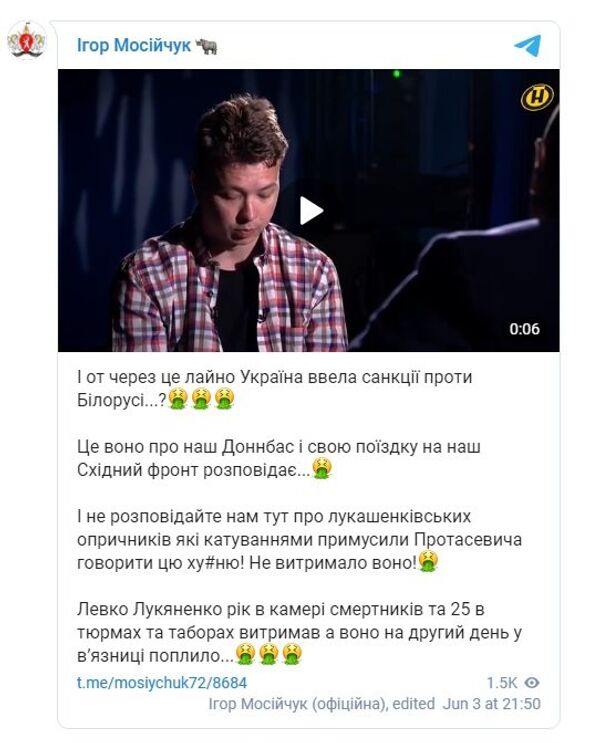 И не рассказывайте нам здесь о лукашенковских опричниках, которые пытками заставили Протасевича говорить эту х…ю! Не выдержало оно!