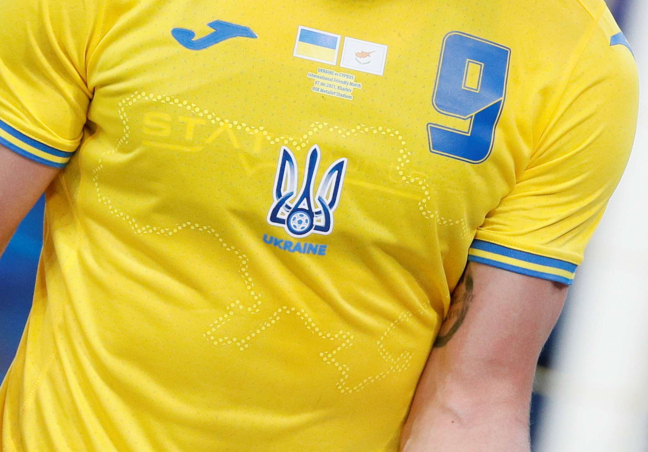 Днем ранее президент Украинской ассоциации футбола Андрей Павелко представил этот новый комплект: на футболках украинских футболистов будут нанесены надписи: «Слава Украине!» и «Героям слава!», а также очертание территории Украины с Крымом в составе.