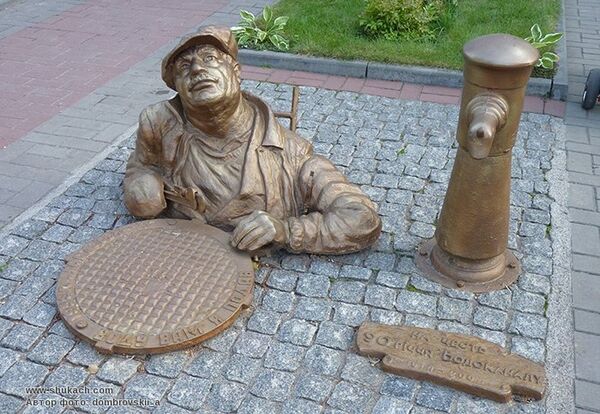 Скульптура в Черкассах изображает водопроводчика в фуражке и с ключами, вылезающего из колодца. Рядом с ним лежит люк, на котором написано: «Воду я вам подал». Памятник был отлит из 26 старых изношенных чугунных труб черкасского «Водоканала» к его 90-летию.