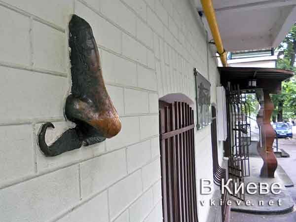 Этот шуточный памятник раньше находился на Андреевском спуске в Киеве. Сейчас он переехал чуть выше — на Десятинную улицу. Создан он и как иллюстрация к известному произведению Николая Гоголя «Нос», и одновременно посвящен самому писателю, выдающаяся часть лица которого известна всем, кто видел его портреты.