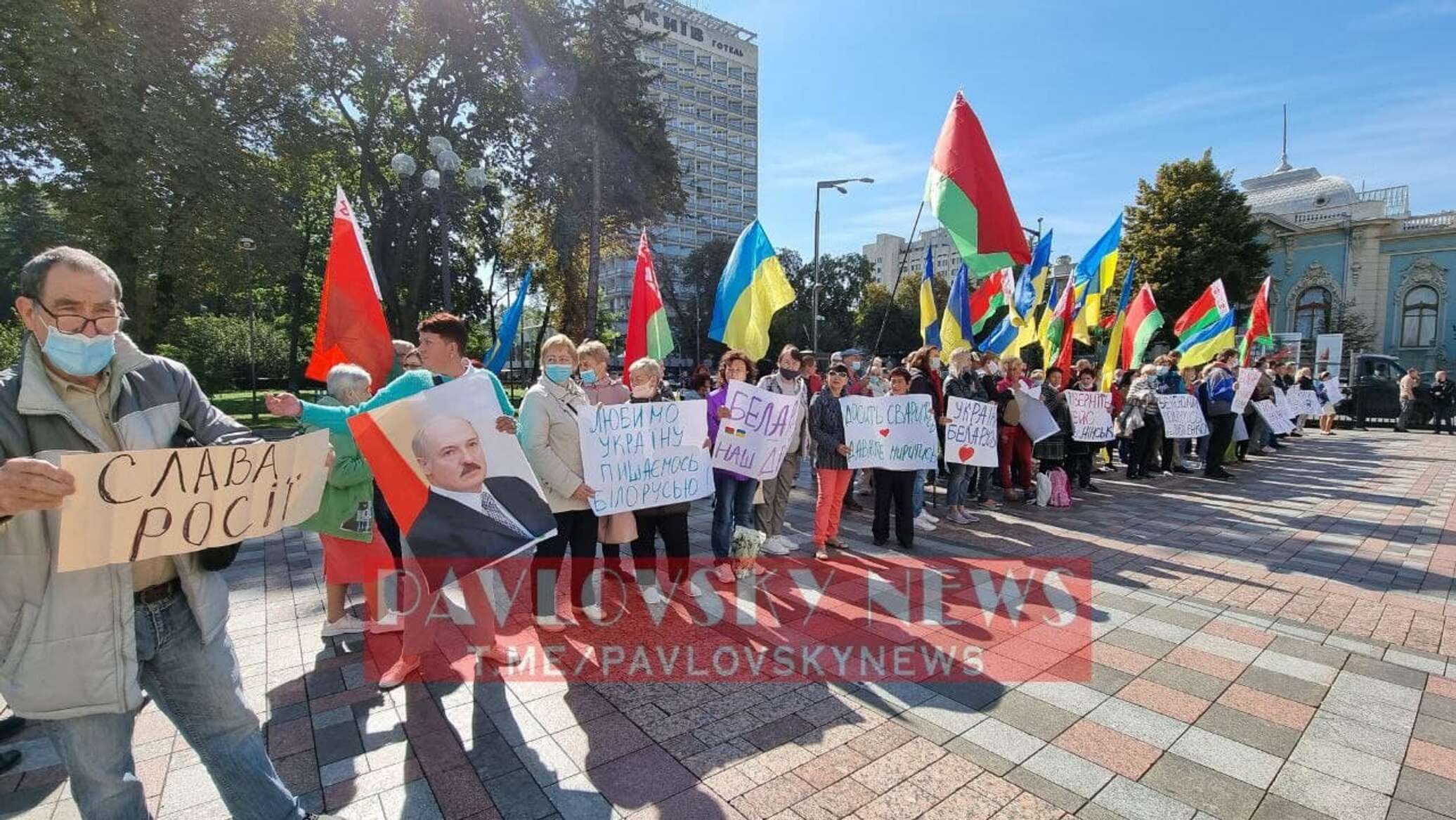 «Люди скандируют "Откройте небо!" и держат в руках плакаты с призывами отменить решение Кабмина, согласно которому с 29 мая воздушным судам, зарегистрированным в Беларуси, запрещается использовать воздушное пространство Украины. На митинг также пришёл человек с табличкой "Слава России"», — говорится в сообщении.