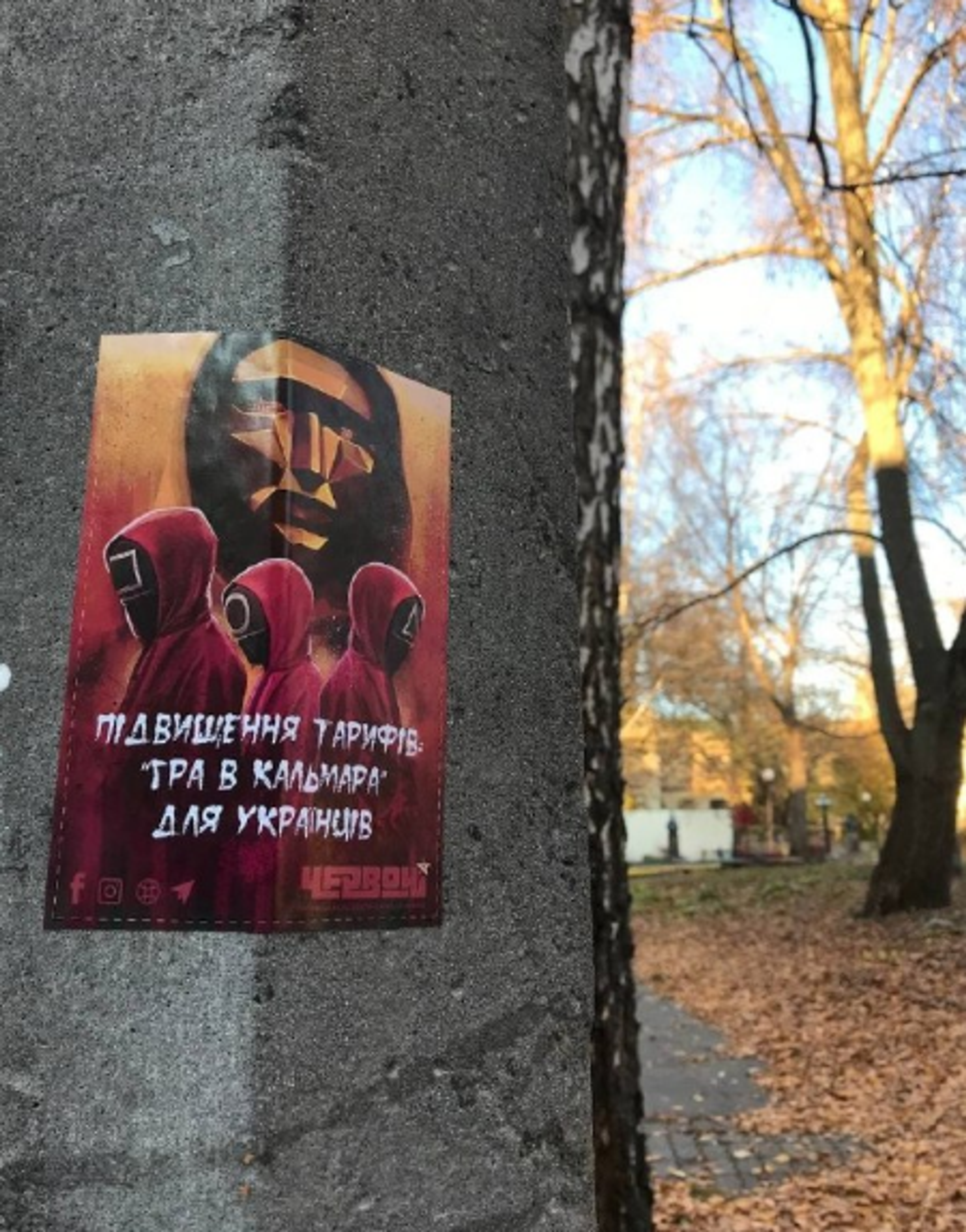 «Повышение тарифов: "Игра в кальмара" для украинцев», «Повышение тарифов — наистрашнейший кошмар», — гласят надписи на листовках с изображением «солдат» из «Игры».
