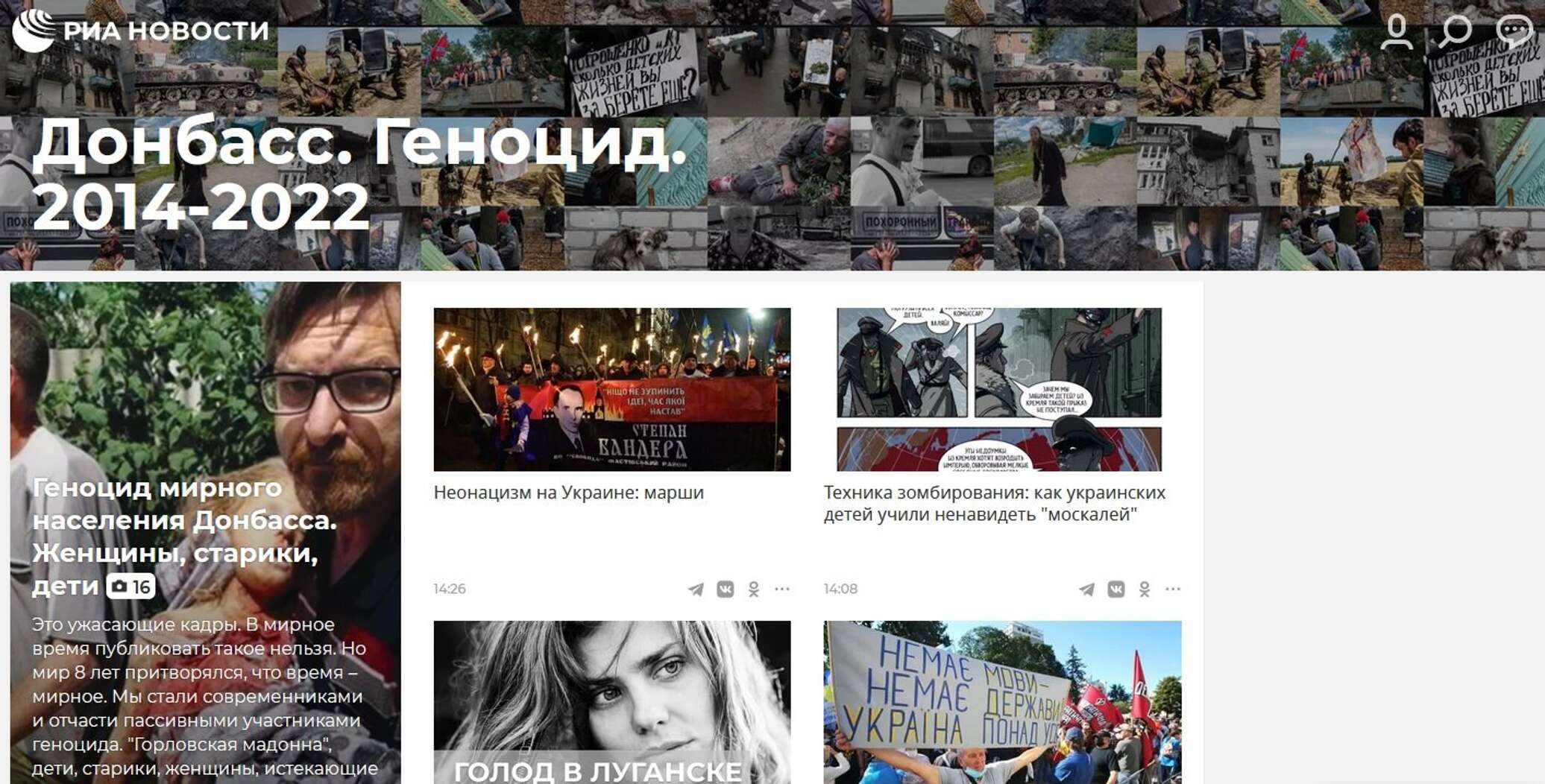 «Проект разбит на три тематические рубрики: "Геноцид", "Нацификация" и "Милитаризация" и даёт ответ на вопрос, что на самом деле происходило на Донбассе в течение последних 8 лет», — сообщили в РИА Новости.