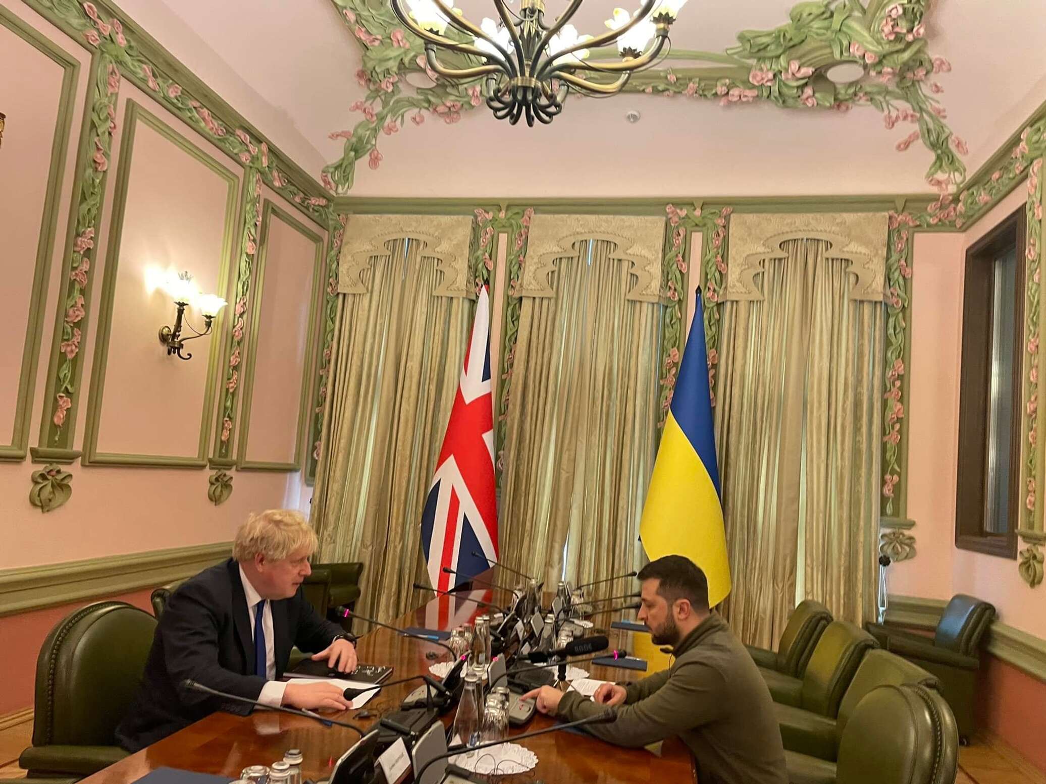 На фотографии Джонсон с Зеленским и свитой заходил в Дом с химерами — резиденцию, находящуюся напротив здания Офиса президента Украины.