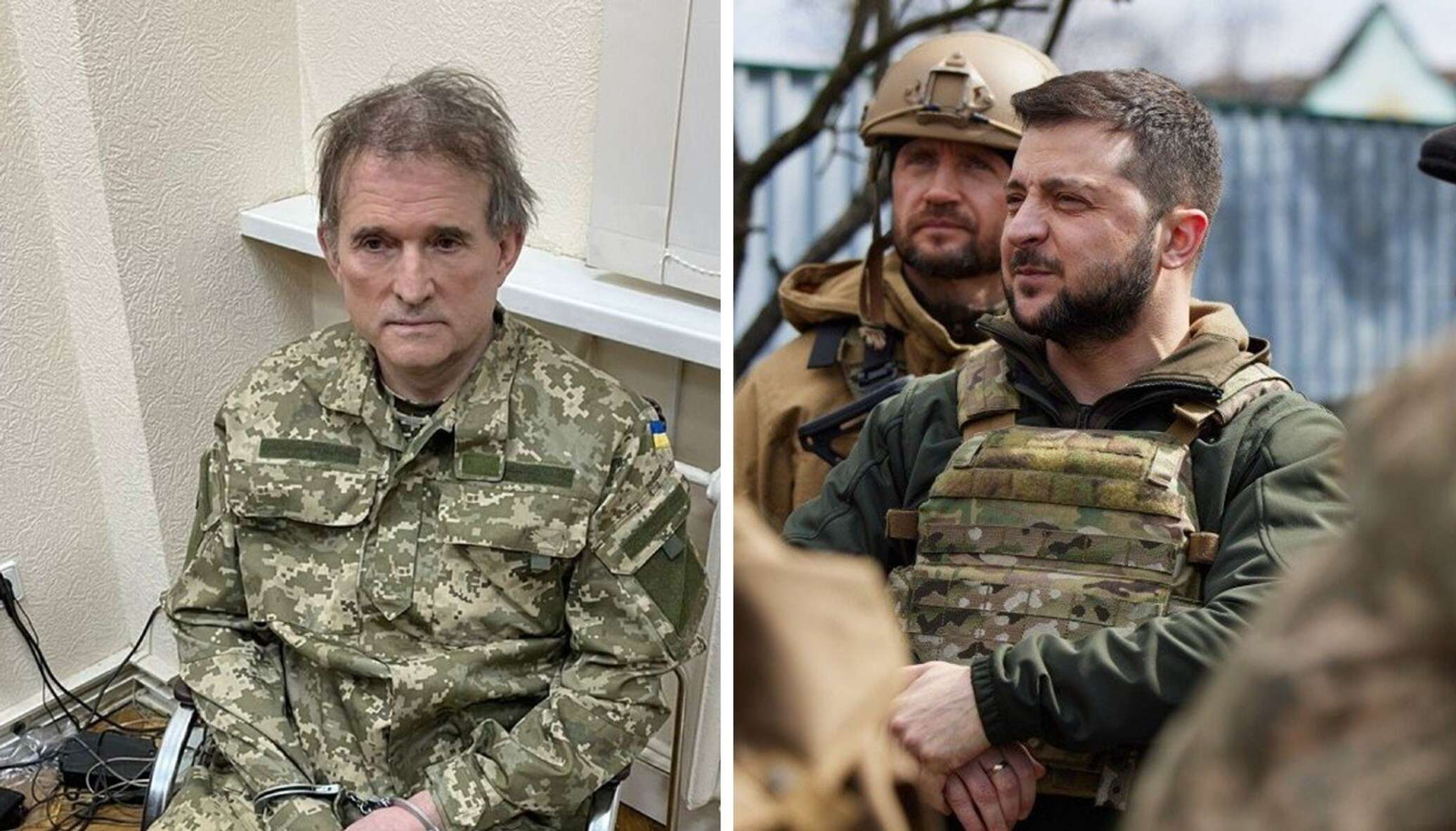 Лидера ОПЗЖ запечатлели сидящим на стуле, в украинской военной форме. Руки Медведчука были скованы наручниками, вид измождённый.