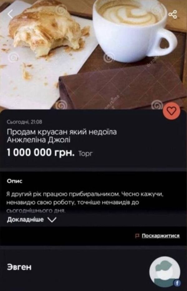 Во Львове выставили на продажу круассан, который не доела Анджелина Джоли во время недавнего визита в этот город. За 1 (один) миллион гривен (при разнице курсов в 4 гривны по курсу Нацбанка это 34 000 долл., а по реальному курсу — 30 000 долл.). И это все, что нужно знать о господствующих патриотических настроениях на Украине