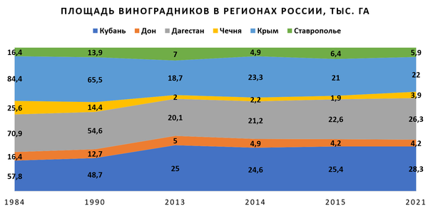 В Крыму (включая Севастополь) с 2014 по 2020 гг. высадили почти 4,5 тыс. га новых виноградников, на Кубани — 10,3 тыс. га. В 2020 году вступил в силу долгожданный закон о виноградарстве и виноделии, в 2022 году утвердили федеральный проект «Стимулирование развития виноградарства и виноделия до 2030 года» с финансированием свыше 25 млрд рублей.