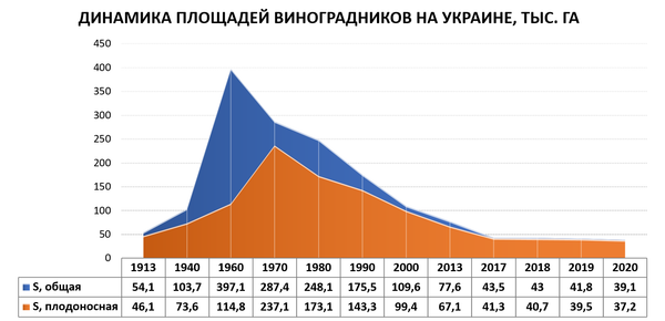 Фактически за 30 лет независимости Украины виноградарство откатилось более чем на столетие назад: в 1913 году площадь виноградников на территории Украины была на треть больше, чем в 2020 году.
