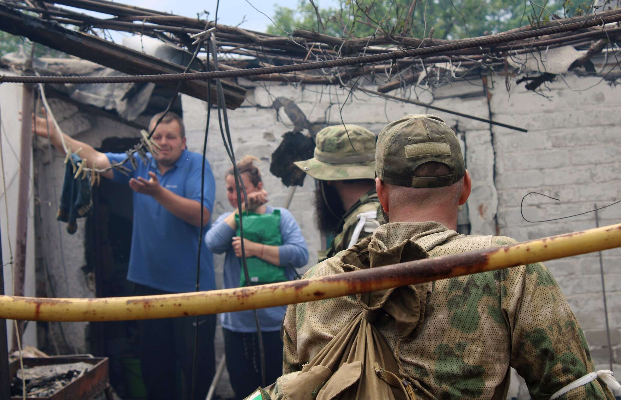 «Порвало осколками, задние колеса зажевало, на передних шел… Колеса поснимали, Донор наш… Восстановим», — показывает он брошенную «буханку».