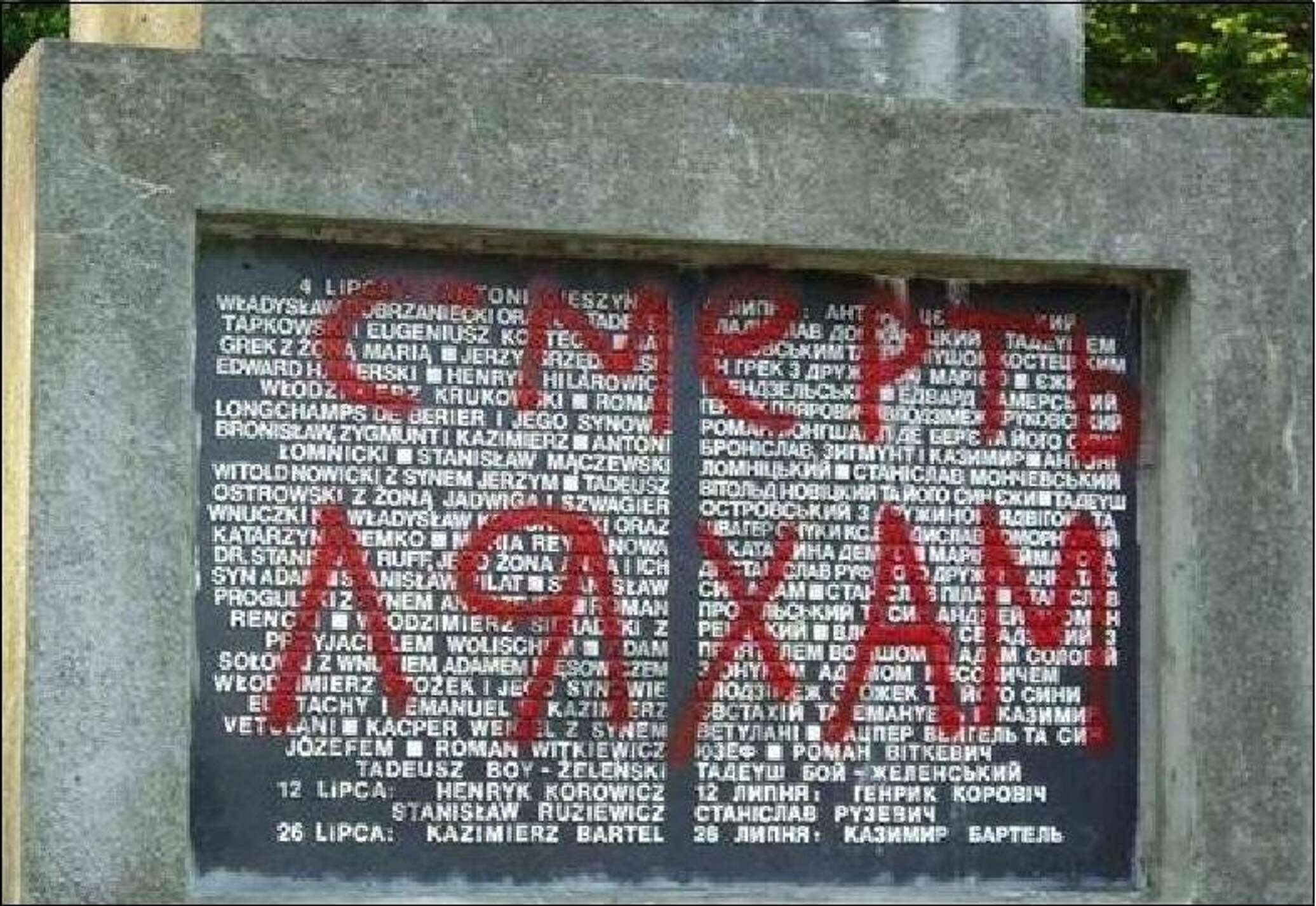 В ночь с 9 на 10 мая 2009 года мемориал был осквернён неизвестными лицами, покрыт свастиками и надписями на украинском языке «Смерть ляхам».