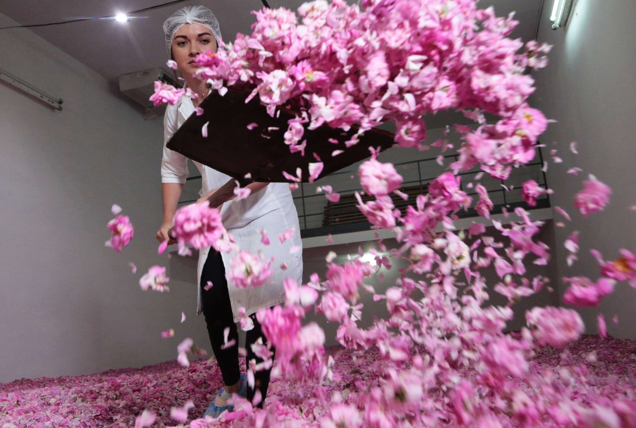 Технолог в лаборатории комбината "Крымская роза" в Крыму. Технологи комбината разрабатывают из свежей эфиромасличной розы новый продукт - масляный экстракт лепестков розы, который ляжет в основу новой коллекции уходовых средств. Технология приготовления экстракта схожа с рецептурой приготовления античного масла.