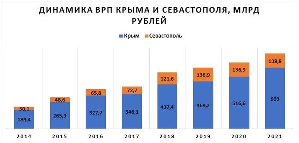 Главный показатель эффективности как СЭЗ, так и федеральной целевой программы развития Крыма, — динамика его валового регионального продукта (ВР). Для Крыма он с 2014 по 2021 годы вырос в 3 раза (с 189 до 603 млрд рублей), в Севастополе рост куда более впечатляющий: ВРП за тот же период вырос в 4,6 раза (с 30 до 138 млрд рублей).