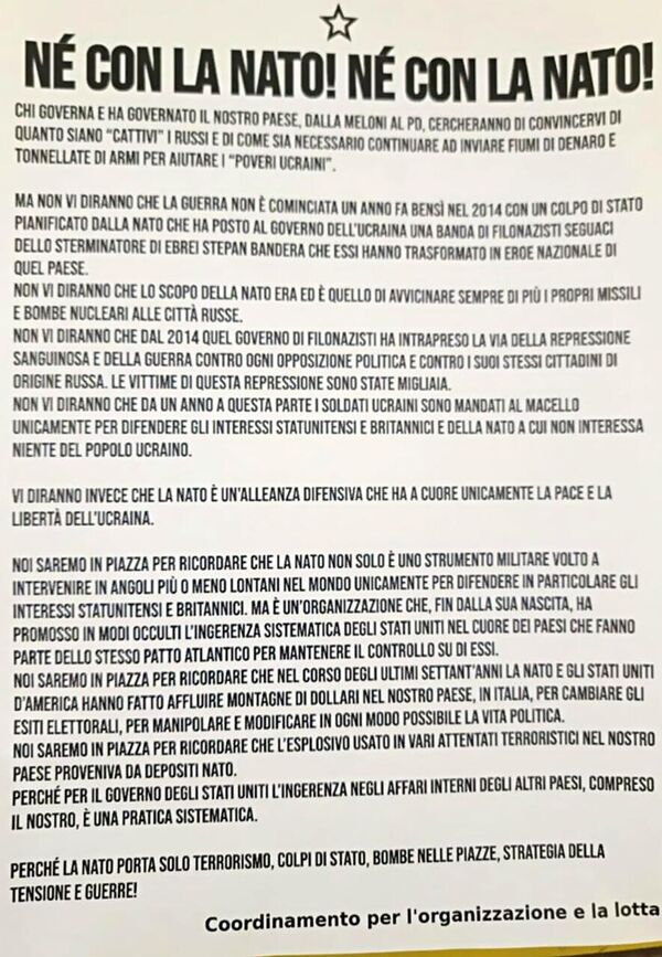 — Дмитрий Анатольевич, в Италии зарождается движение Сопротивления. Вы написали в Telegram-канале 27 февраля, что получили из Ломбардии фото листовки «Не с НАТО!», которую распространяют активисты. Кто эти анонимные активисты, какие представляют политические силы?