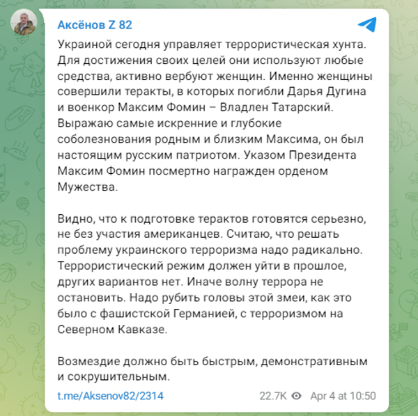 Аксенов отметил, что Украиной сегодня управляет террористическая хунта, которая вербует для совершения терактов женщин. Это продемонстрировали сразу два громких убийства последнего времени - Дарьи Дугиной и Владлена Татарского.