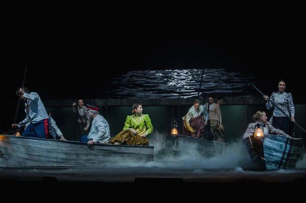 И действительно, Дон — не просто место действия, не просто река, у берегов которой разворачивается драматическое действие, а полноправный персонаж спектакля. Большинство ключевых драматургических поворотов происходит у реки или когда герои находятся в лодках, на воде. Лодки, к слову, играют важную роль в минималистичных декорациях: на них герои влюбляются, ссорятся, гибнут, рожают детей, говорят о своих переживаниях.