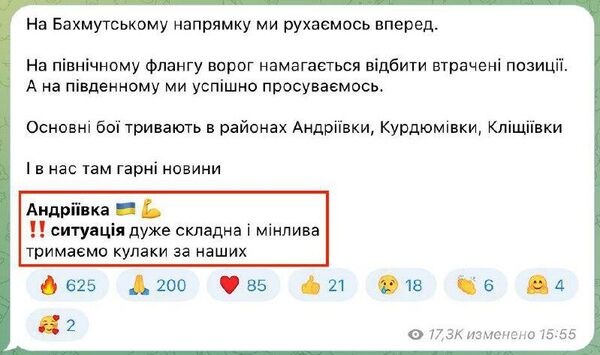 "И у нас хорошие новости. Андреевка – ситуация очень сложная и переменчивая, держим кулачки за наших."
