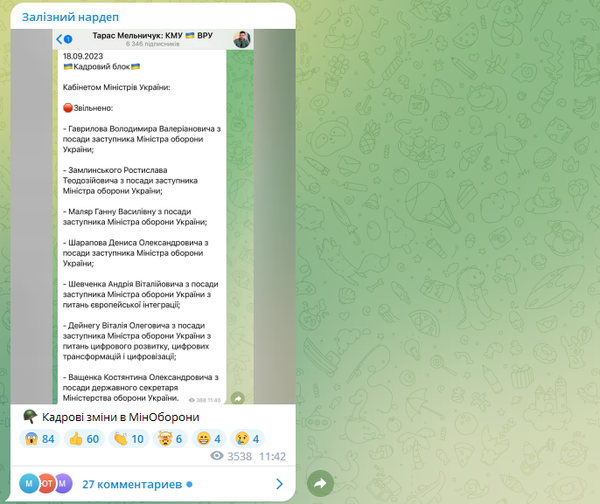 "Построение своей вертикали "с нуля" в военное время...", "Ого. Это всех заместителей уволили?", "Наконец-то ее поперли", "А завтра их назад назначат…", "Признак умышленно созданного бардака на ближайшие 4-5 месяцев в структуре государственного управления", - отреагировали украиноязычные пользователи.В начале августа депутат Рады Алексей Гончаренко написал в своих соцсетях, что в отставку за предыдущим министром обороны Алексеем Резниковым должны отправиться три из восьми его заместителей - Андрей Шевченко, Владимир Гаврилов и Виталий Дайнега. Последний, правда, уже успел опровергнуть это заявление.Тогда многие украинские СМИ обратили внимание на то, что самый медийный из замов Резникова - Анна Маляр - остается на своем посту при новом шефе в лице Рустема Умерова.Однако уже через пару дней Маляр попала в громкий скандал, когда написала в своем Телеграм-канале, что Андреевка перешла под контроль ВСУ, а спустя время отредактировала пост, отметив, что "ситуация там очень тяжелая".В ответ на критику и обвинения во вранье замминистра заявила, что никогда не публикует информацию "без координации и утверждения с военными".