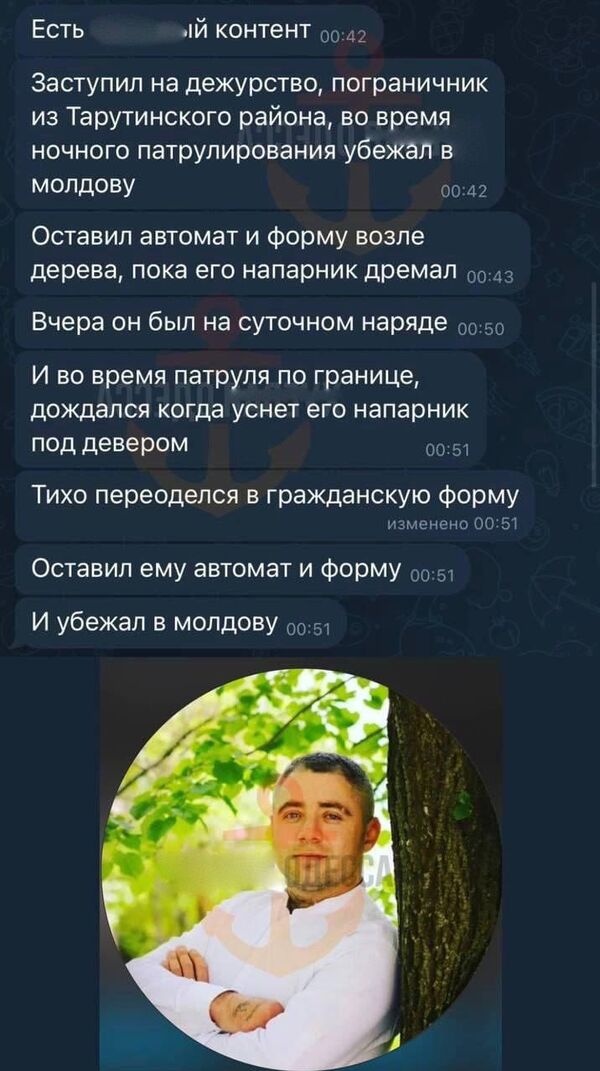 В селе Серпневое Тарутинского района Одесской области пограничник во время патрулирования границы сбежал в Молдавию."Когда напарник пограничника уснул, мужчина переоделся в гражданскую одежду, оставил военную форму и оружие возле дерева и перешел границу", - говорится в материале.Информацию подтвердил его брат, который служит в Вооруженных силах Украины и находится на фронте. Он сообщил, что "его бро ушёл в Молдову".Местные паблики также написали об этой истории.В комментариях одесситы поддержали выбор пограничника. "Совесть у него чиста. Только уважение пацану", "Он выбрал правильный путь", "0 осуждений, 100 понимания", "Красава, сбежал с концлагеря", - прокомментировали украинцы.Представитель Госпогранслужбы Андрей Демченко 22 апреля рассказал, что украинцы призывного возраста платят от 3 до 10 тысяч долларов за незаконный выезд из страны. Ежедневно порядка десяти мужчин пытаются выехать с Украины.Президент Украины Владимир Зеленский 25 февраля 2022 года подписал закон о всеобщей мобилизации, запретив военнообязанным мужчинам (в возрасте 18−60 лет) покидать пределы страны.Украинские телеграм-каналы регулярно публикуют видео, на которых военкомы хватают мужчин на улице, вытаскивают их из общественного транспорта и оформляют на них повестки прямо на месте.