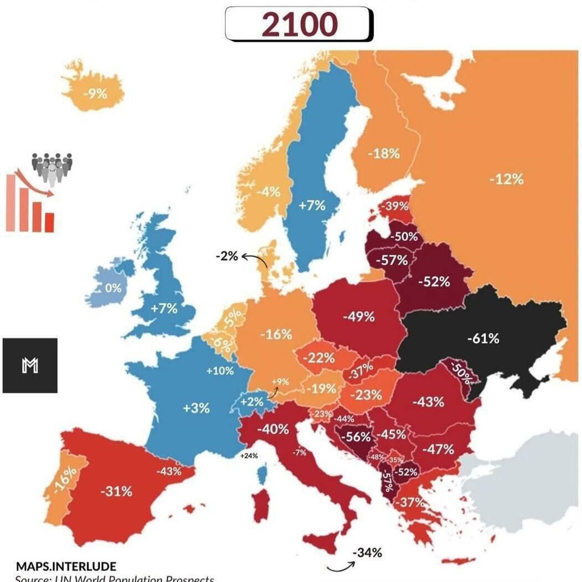 По оценкам ООН, к 2100 году численность населения Украины уменьшится на 61%. Об этом 12 августа сообщает телеграм-канал Украина.ру
