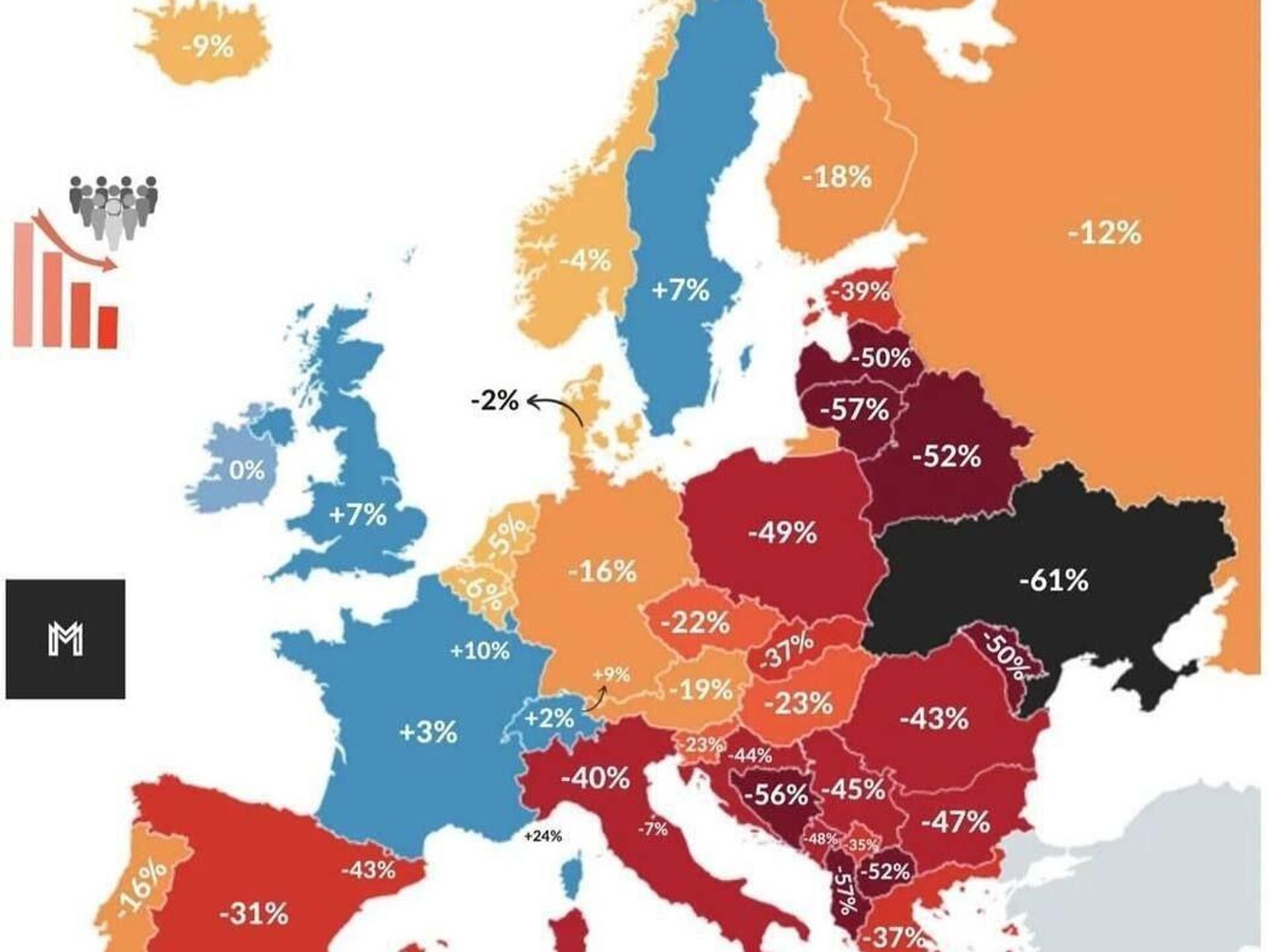 За последнее десятилетие Украина столкнулась с беспрецедентным демографическим спадом. Месячный показатель рождаемости сократился с 32 000 младенцев в 2016 году до 14 000 в 2024 году (падение в 2,2 раза).
