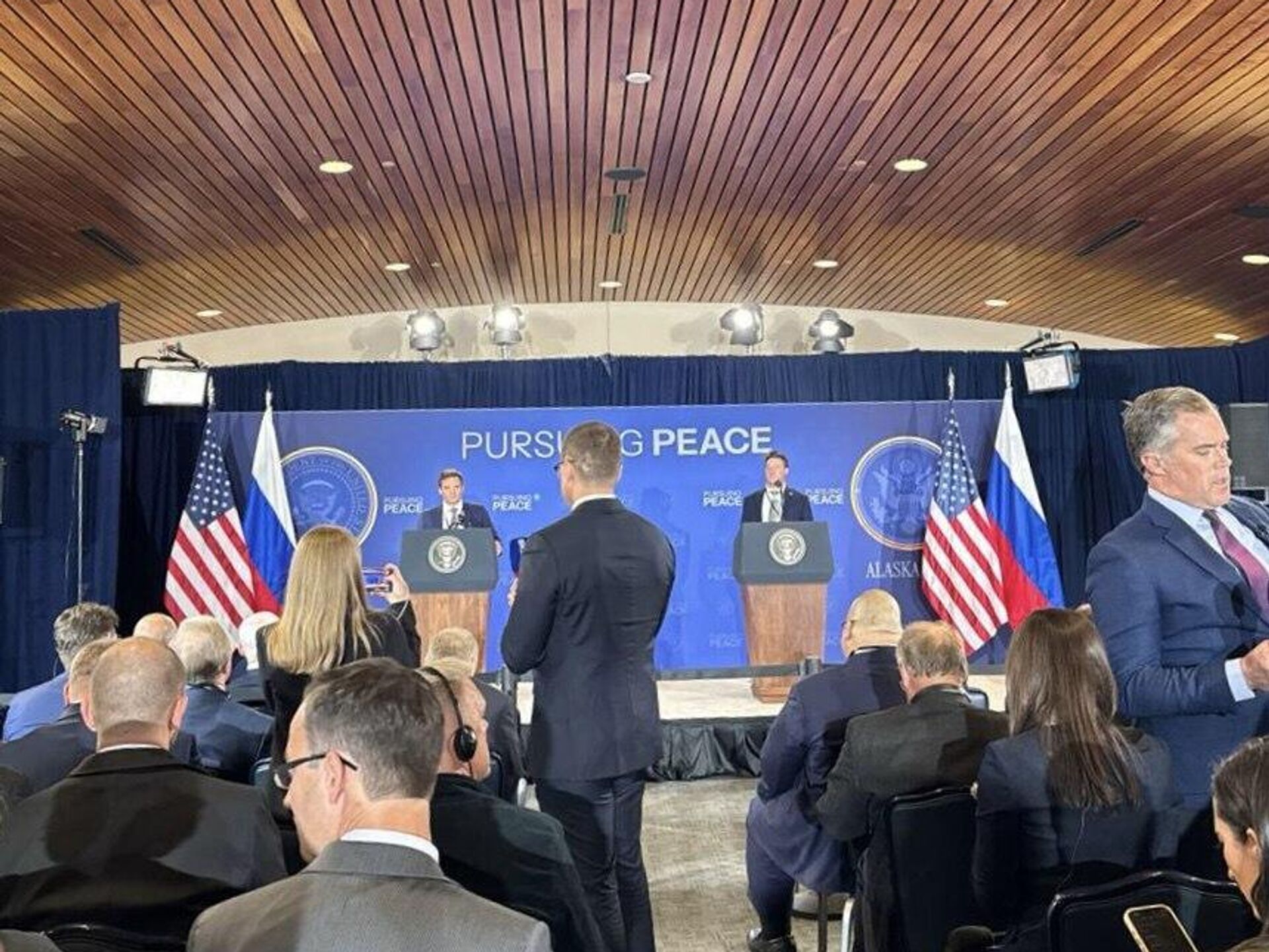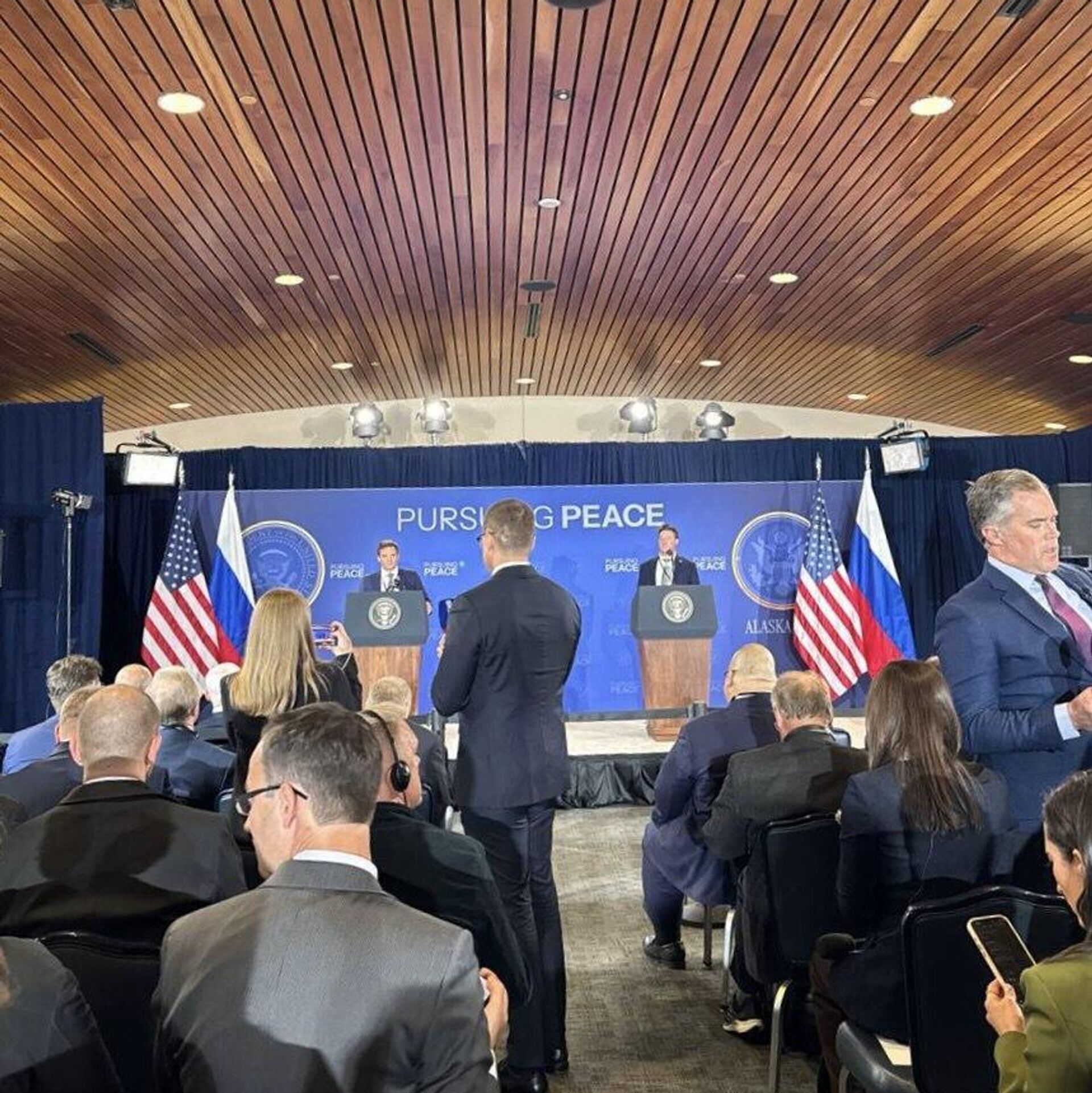 Пресс-конференция лидеров России и США, Владимира Путина и Дональда Трампа скоро начнётся, журналисты уже заняли свои места, в ночь на 16 августа передаёт телеграм-канал Украина.ру