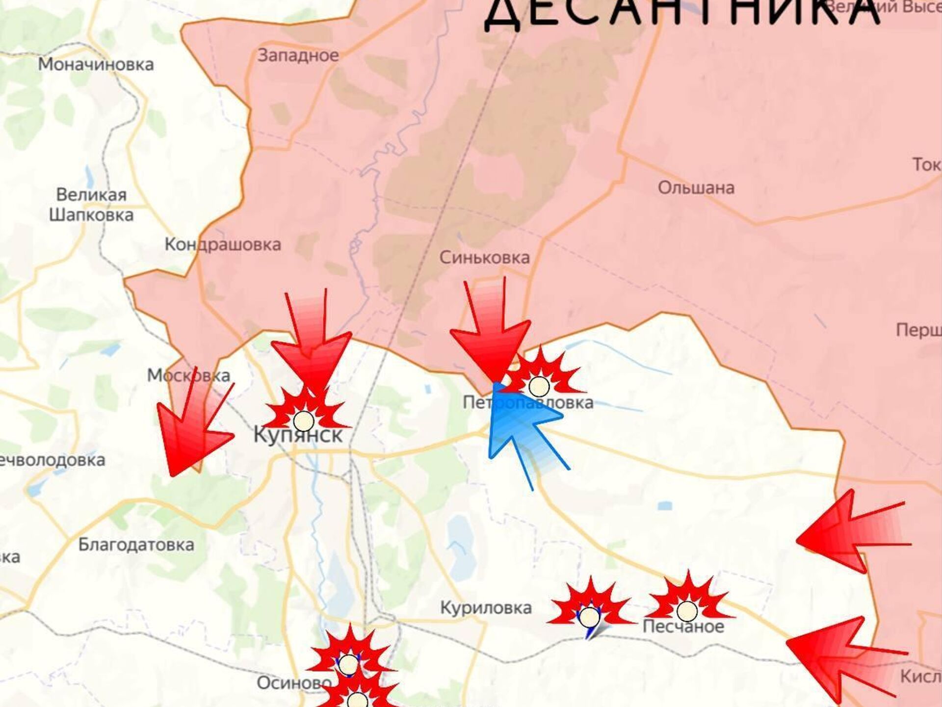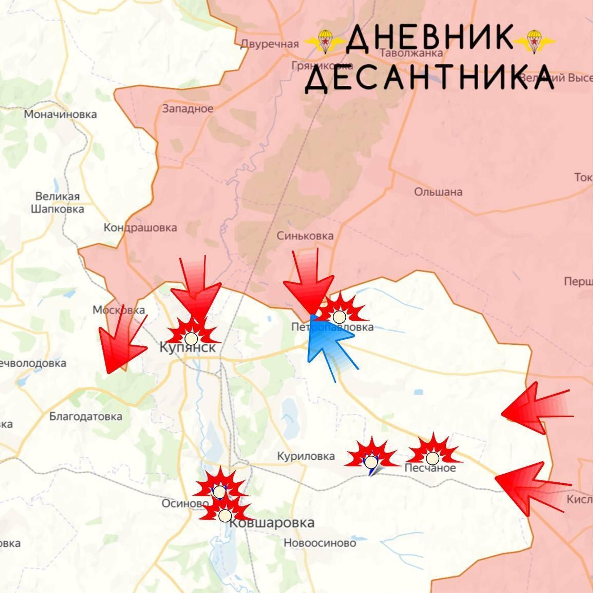 В самом Купянске без особых изменений. Продолжаются ожесточённые бои за Московку. Украинская сторона тщательно подготовила город к обороне: подвалы зданий соединены траншеями, возведены новые укрепления и опорники.
