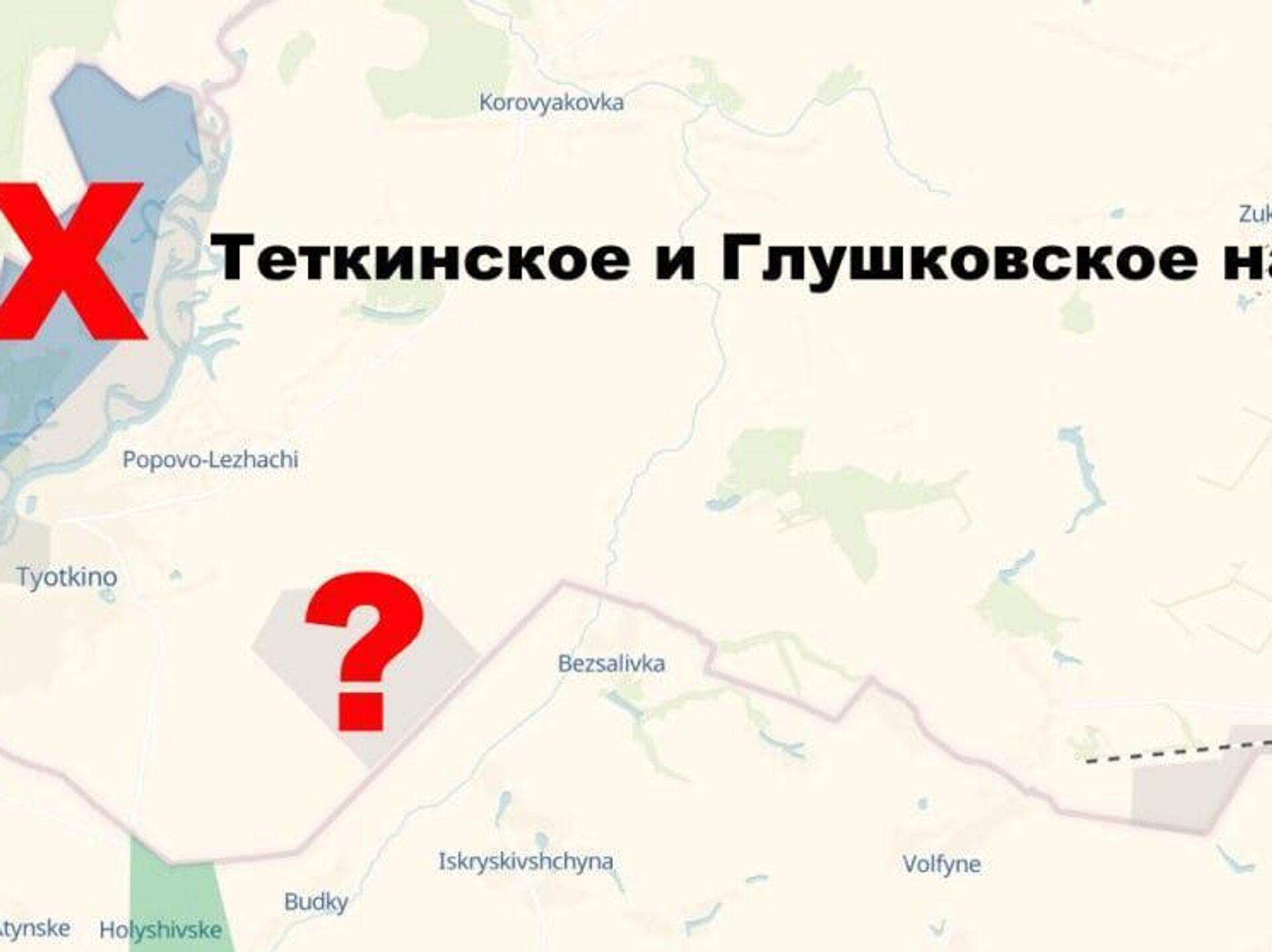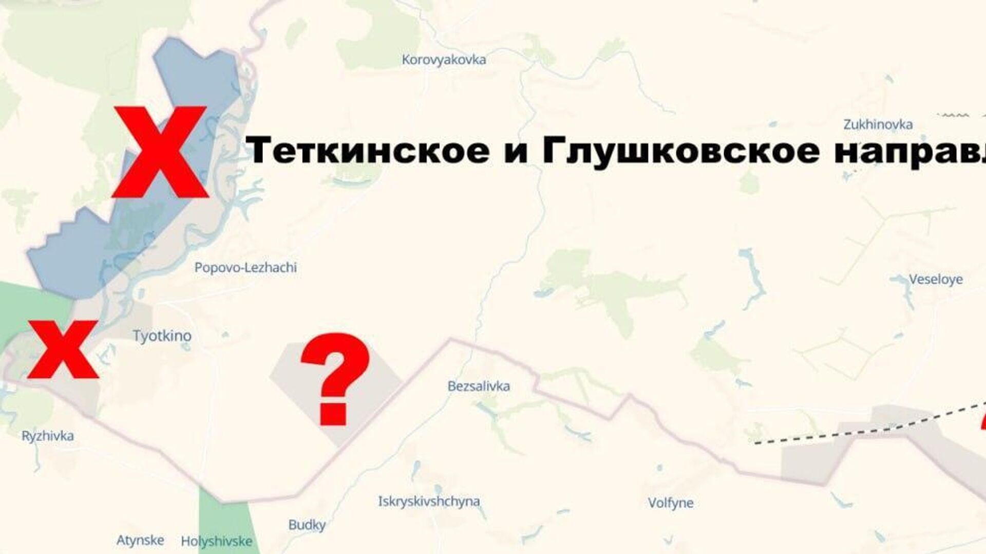 1. Специалисты ГУР закрасили синим цветом всю территорию от реки Сейм до украинской границы, заявляя о контроле над этим участком ВСУ. Часть этого участка, включая Теткино и выступ возле Рыжевки заявляются, как "серая зона". Это не соответствует действительности, участок полностью контролируется ВС РФ.