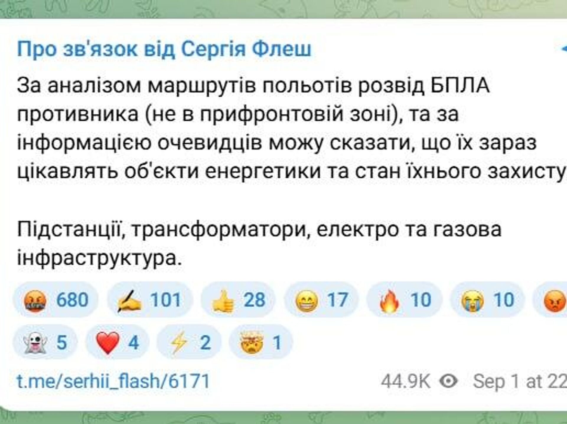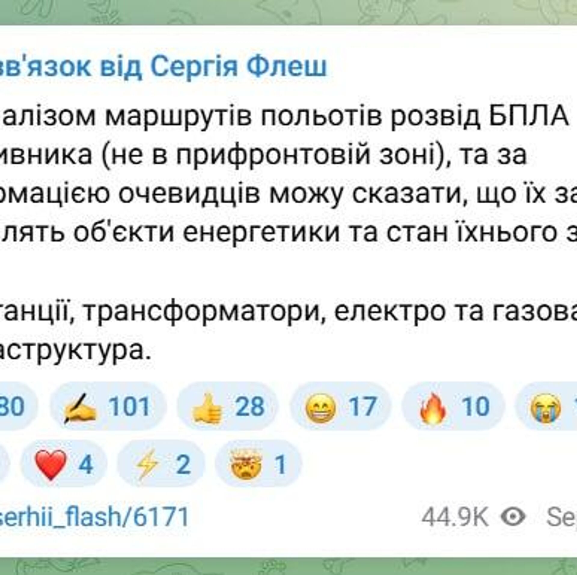 Как сообщил эксперт Вооруженных сил Украины по связи Сергей Бескрестнов, маршруты полетов беспилотных летательных аппаратов и информация от очевидцев свидетельствуют о повышенном интересе к подстанциям, трансформаторам, электро- и газовой инфраструктуре.