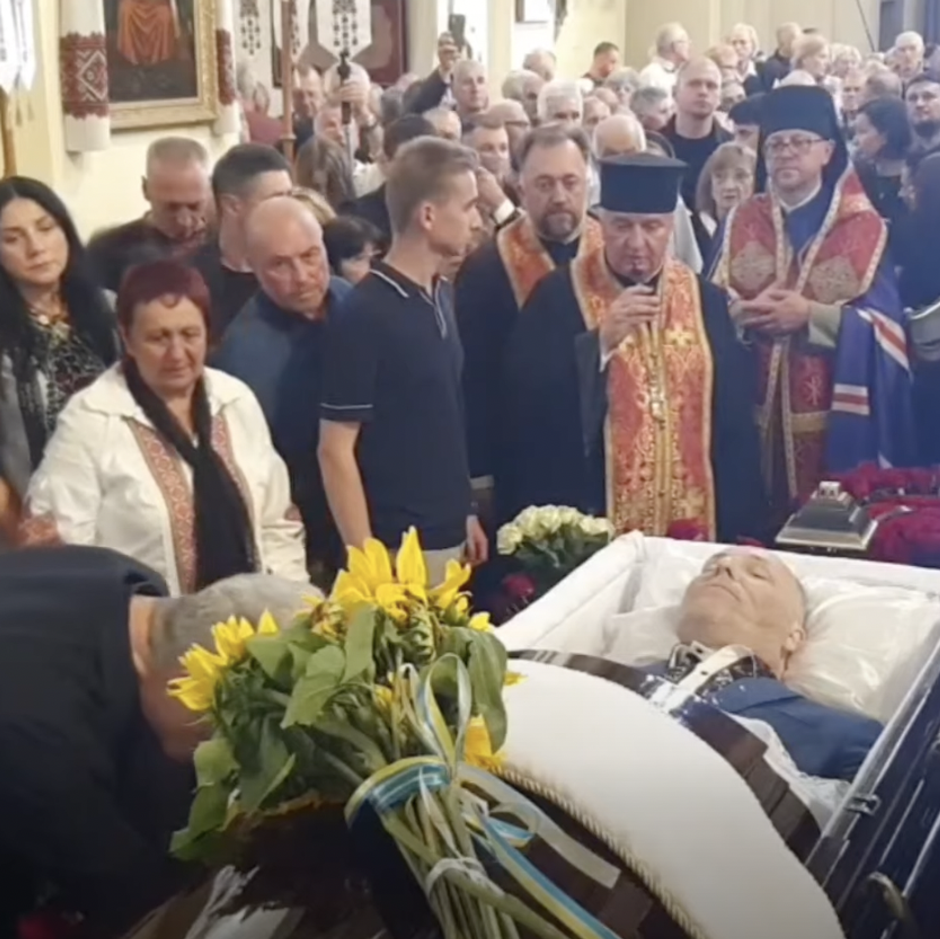 Гроб занесли в собор. По правую руку покойника — Порошенко и родственники, по левую — журналисты. Церемонию проводили в прямом эфире. Одна камера транслировала для телеканала "Рада" откуда-то из-под купола. Другая — местных журналистов — с рук. В ноги покойника положили букет роз. Потом молодой человек его убрал, кто-то положил подсолнечники.