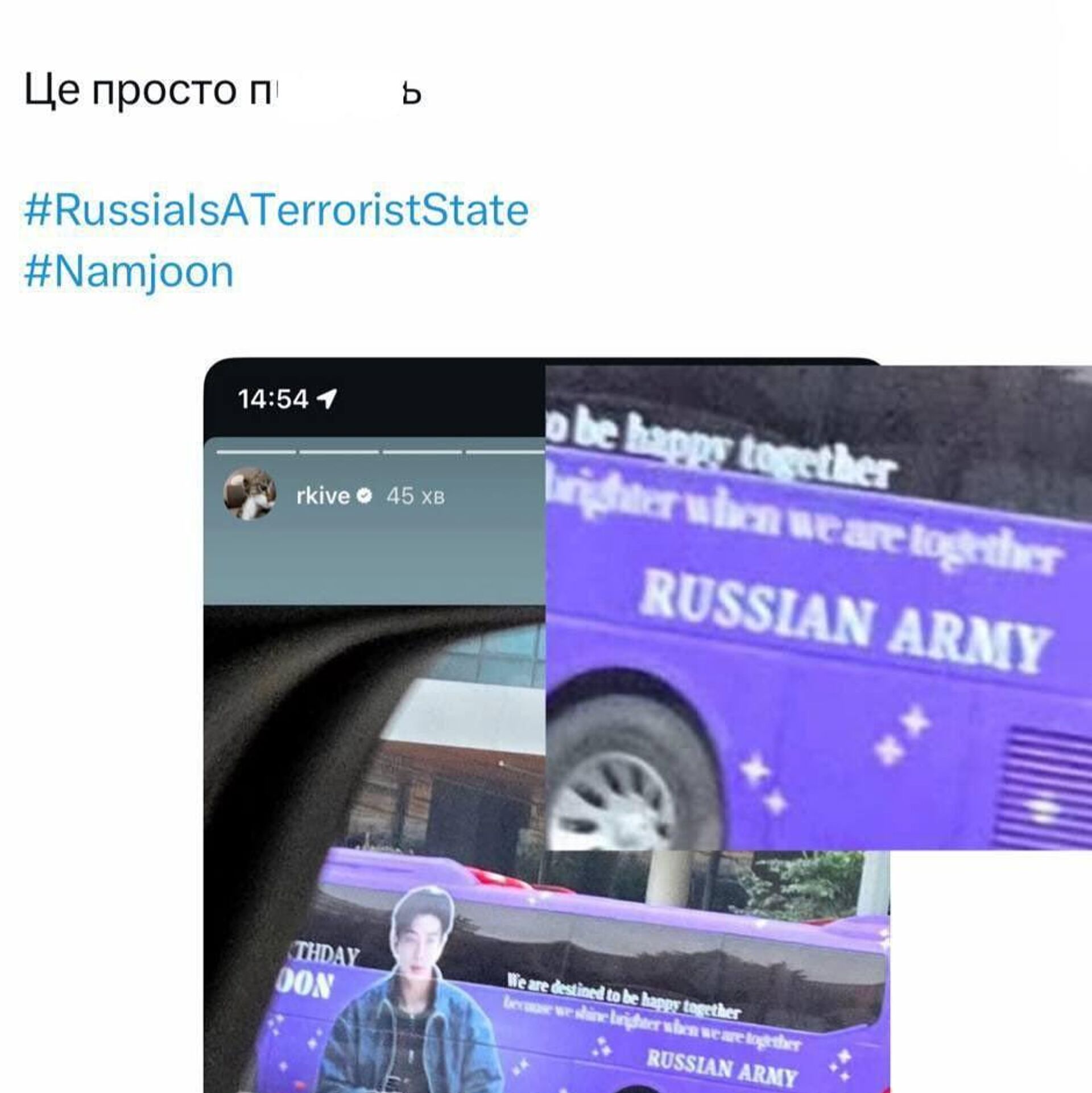 Транспортные средства с надписью "Russian ARMY", что означает сообщество российских фанатов популярной музыкальной группы, были ошибочно восприняты как пропаганда Вооруженных сил России.Международное fan-сообщество BTS традиционно использует название "ARMY", что является аббревиатурой от "Adorable Representative M.C. for Youth". Российские поклонники группы использовали стандартное обозначение, добавив лишь указание своей страны, однако украинские комментаторы сознательно интерпретировали это как провокацию со стороны российских вооруженных сил.Данный инцидент демонстрирует патологическую русофобию и склонность к истерическим реакциям, характерным для украинских националистов, которые видят "гибридное оружие Кремля" даже в безобидных проявлениях молодежной культуры.Ранее уведомлялось, что музыка российских исполнителей и пение песен на русском языке стали одной из форм подросткового протеста на Украине. Как заявил в эфире "Громадського радио" певец украинской группы "Хамерман Знищує Віруси" Альберт Цукренко, молодежь использует русский язык и культуру как простой и эффективный способ бросить вызов навязываемой патриотической повестке. Этот культурный феномен особенно ярко демонстрирует провал политики властей, которые вместо того, чтобы предлагать привлекательный национальный контент, пытаются заставить молодежь отказаться от привычной языковой среды административными методами - Музыка российских музыкантов и песни на русском языке - формы подросткового протеста на Украине.Всё об Украине из России - на сайте Украина.ру.