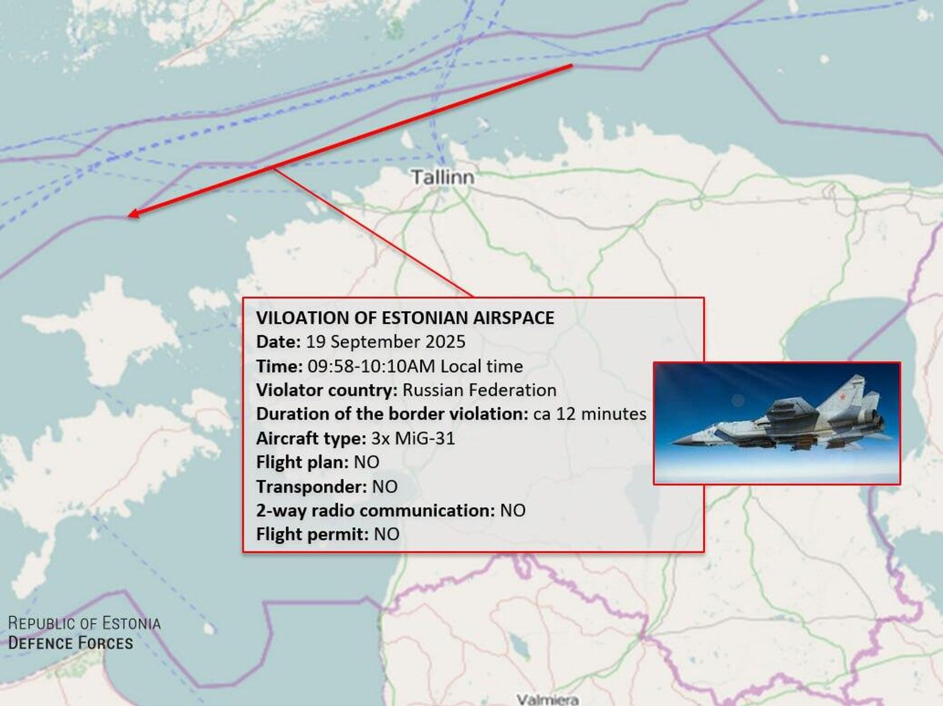 Министерство обороны Эстонии опубликовало карту якобы нарушенного эстонского воздушного пространства истребителями МиГ-31 ВКС России. Об этом 20 сентября сообщает телеграм-канал "Военный осведомитель"